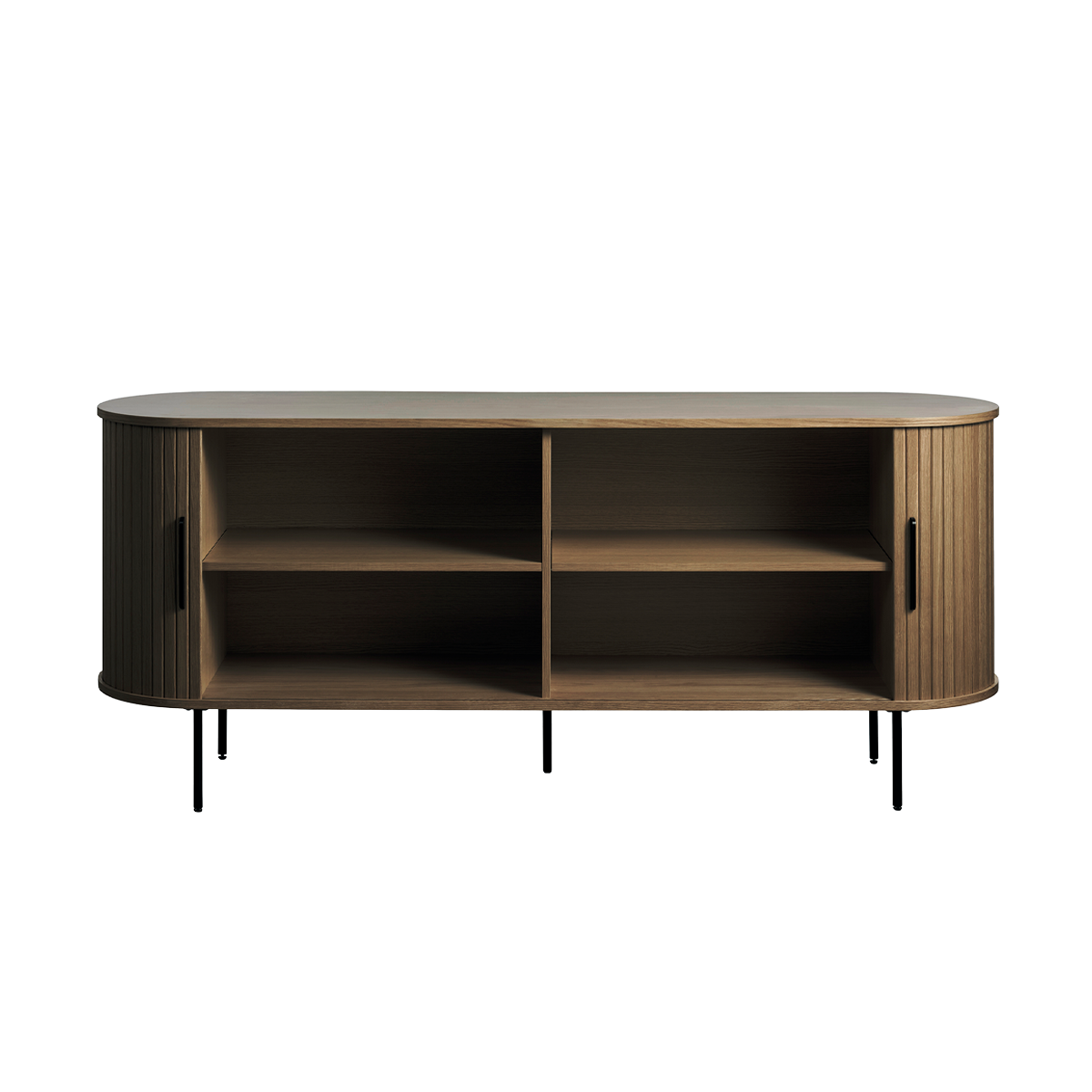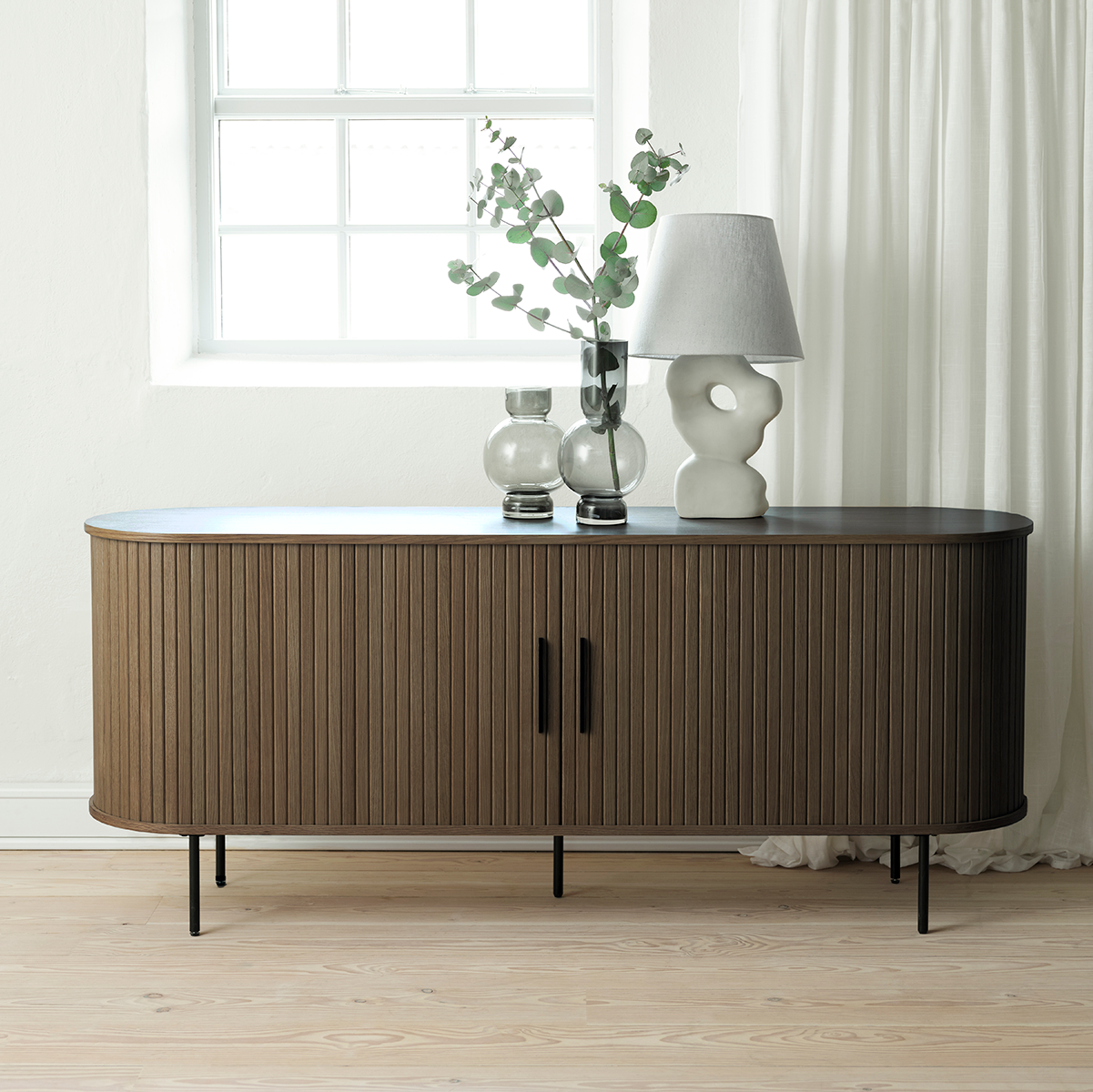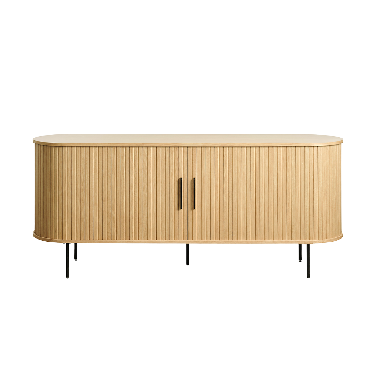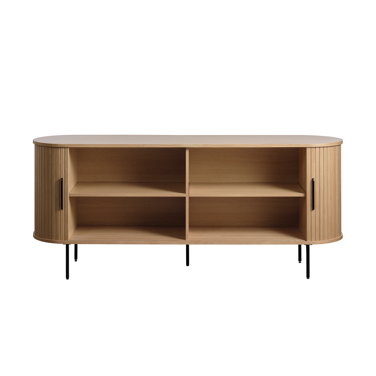 Dit stijlvolle dressoir Lenn van het merk Olivine is een echte eyecatcher in huis. Het dressoir van hout is een functioneel meubelstuk dat perfect past in elke moderne woonruimte. Met zijn strakke lijnen en tijdloze ontwerp brengt dit sideboard een warme en uitnodigende sfeer in huis. Het dressoir is gemaakt van hout en is afgewerkt met een laag eikenfineer. De vijf slanke metalen pootjes en de twee handvaten in zwarte kleur vormen een mooi contrast met het natuurlijke hout. De kast is ontworpen met schuifdeuren, wat het meubel de ideale keuze maakt voor een smalle ruimte. Binnenin het dressoir zitten vier ruime opbergvakken en aan de zijkanten zitten nog twee verborgen vakken. Dankzij de handige afmetingen kan dit houten sideboard zowel dienen als dressoir, lage kast, en zelfs als tv-meubel. Het Lenn dressoir is verkrijgbaar in vier kleuren: wit eiken, zwart eiken, gerookt eiken en naturel hout. Daarnaast is deze kast ook in een kleiner formaat verkrijgbaar en