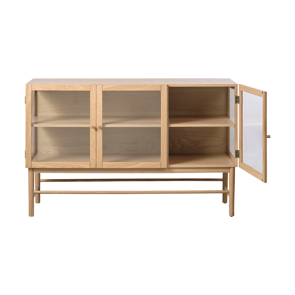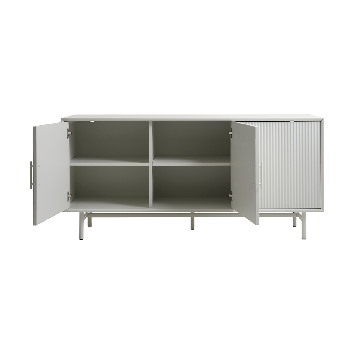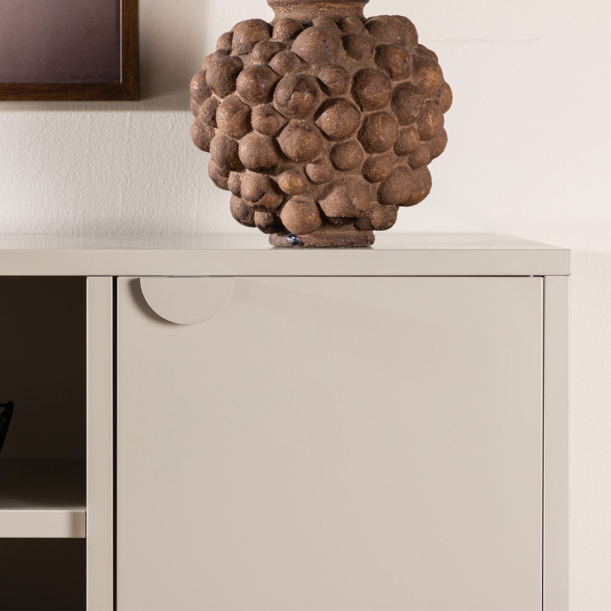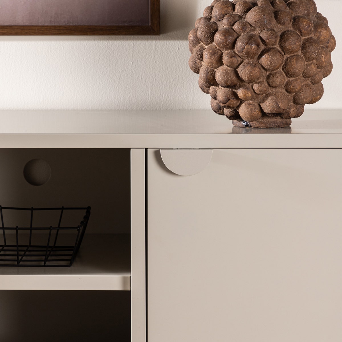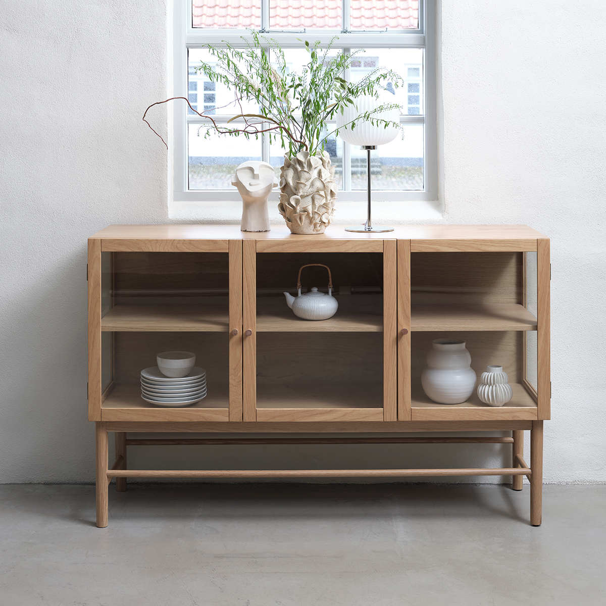 Dit stijlvolle dressoir Lenn van het merk Olivine is een echte eyecatcher in huis. Het dressoir van hout is een functioneel meubelstuk dat perfect past in elke moderne woonruimte. Met zijn strakke lijnen en tijdloze ontwerp brengt dit sideboard een warme en uitnodigende sfeer in huis. Het dressoir is gemaakt van hout en is afgewerkt met een laag eikenfineer. De vijf slanke metalen pootjes en de twee handvaten in zwarte kleur vormen een mooi contrast met het natuurlijke hout. De kast is ontworpen met schuifdeuren, wat het meubel de ideale keuze maakt voor een smalle ruimte. Binnenin het dressoir zitten vier ruime opbergvakken en aan de zijkanten zitten nog twee verborgen vakken. Dankzij de handige afmetingen kan dit houten sideboard zowel dienen als dressoir, lage kast, en zelfs als tv-meubel. Het Lenn dressoir is verkrijgbaar in vier kleuren: wit eiken, zwart eiken, gerookt eiken en naturel hout. Daarnaast is deze kast ook in een kleiner formaat verkrijgbaar en