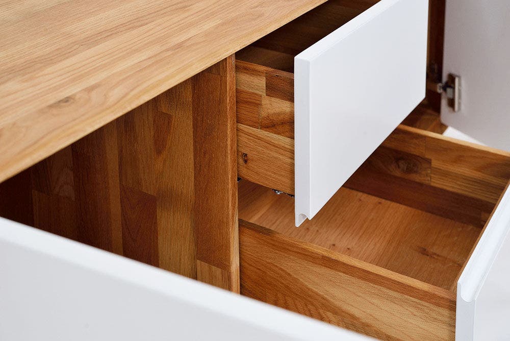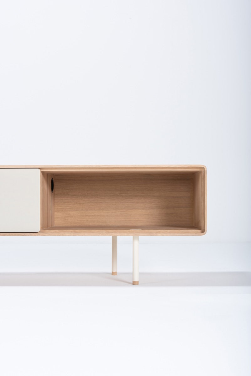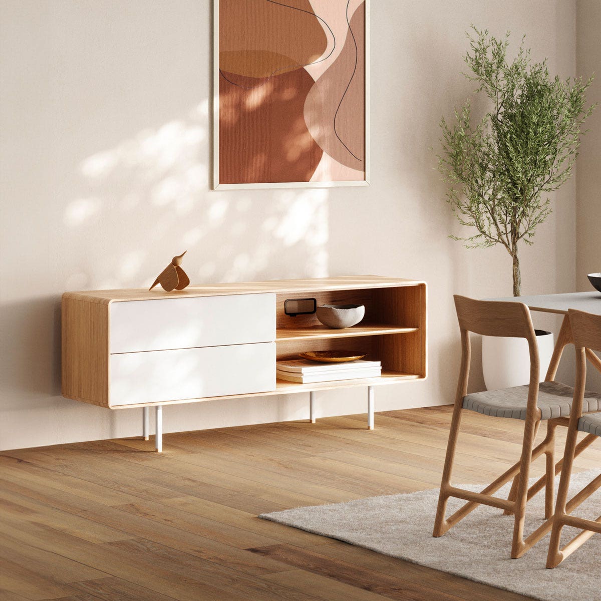 Het Gazzda Fina Lowboard is een retro dressoir die in elk interieur past. Het prachtig afgewerkte eikenhout met de witte linoleum lades zorgen voor een mooi contrast tussen klassiek en modern. Het eikenhouten dressoir heeft twee lades met soft-close systeem, wat ervoor zorgt dat de lades geleidelijk sluiten. Aan de rechterkant zit een open vak - perfect voor een mediabox die hierdoor met de afstandbediening altijd bereikbaar is. Aan de zijkant van het open vak en de achterzijde van het TV meubel zitten uitsparingen voor de kabeldoorvoer. Dit maakt het TV meubel niet alleen mooi, maar ook heel functioneel. Voordelen Handgemaakt van massief eikenhout Ontworpen met een open vak van 64,4 x 41 x 23,6 cm (BxDxH) Functioneel als TV meubel door de uitsparingen voor kabels De lades zijn voorzien van een laagje linoleum Door het gebruik van wild eikenhout is elk product uniek Voorzien van een