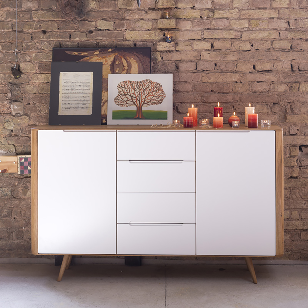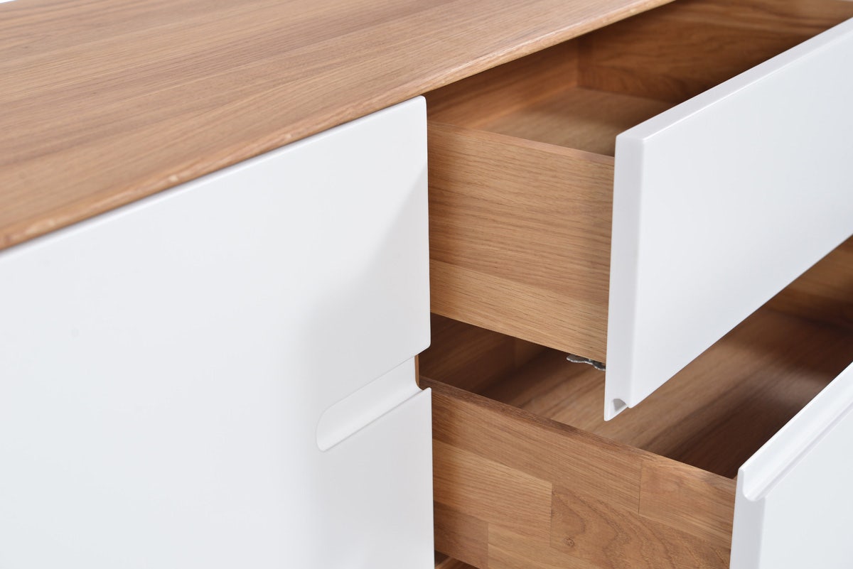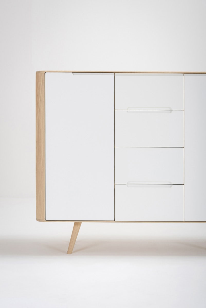 Het Gazzda Ena Sideboard is een prachtig eikenhouten dressoir met een retro jaren ’50 look. De witte lades en deurtjes zorgen voor het moderne contrast in dit massief eikenhouten meubel. Het Ena Sideboard heeft twee lades en twee deurtjes, allemaal met het soft-close systeem. Dit zorgt ervoor dat de lades en kastjes geleidelijk sluiten. Hierdoor is er genoeg opbergruimte voor je spullen. Door het massieve eikenhout is het sideboard een echt Scandinavisch dressoir. Voordelen Scandinavisch dressoir in twee formaten Afmetingen: B 135 x D 42 x H 60 cm Afmetingen: B 180 x D 42 x H 60 cm Handgemaakt van massief eikenhout Beschikbaar in verschillende varianten houtafwerking Door het gebruik van wild eikenhout is elk product uniek Voorzien van een soft-close systeem waardoor de lades en deurtjes geleidelijk sluiten Gemonteerd geleverd - je hoeft alleen nog maar de pootjes