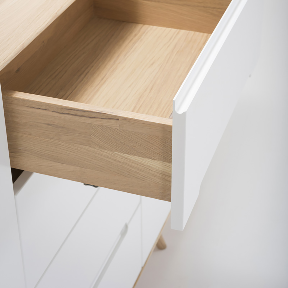 De Gazzda Ena Dresser Two is een Scandinavische opbergkast met een knipoog naar de jaren ’50. Door de combinatie van het eikenhout met de witte lades, krijgt deze opbergkast een retro jaren ’50 look. De Ena Dresser Two is een massief eikenhouten opbergkast met vier lades en twee deurtjes. Achter de deurtjes zitten aan beide kanten twee planken. Deze witte lades en deurtjes hebben het soft-close systeem. Dit zorgt ervoor dat de lades en deurtjes geleidelijk sluiten. Door de vele opbergruimtes, geruisloze lades en perfecte hoogte van 110 cm is deze kast tevens te gebruiken als commode. Voordelen Handgemaakt van massief eikenhout Beschikbaar in verschillende varianten houtafwerking Door het gebruik van wild eikenhout is elk product uniek Ook te gebruiken als commode op de kinderkamer Met hoge kwaliteit afgewerkt, waardoor je er jaren plezier van hebt Gemonteerd geleverd - je hoeft
