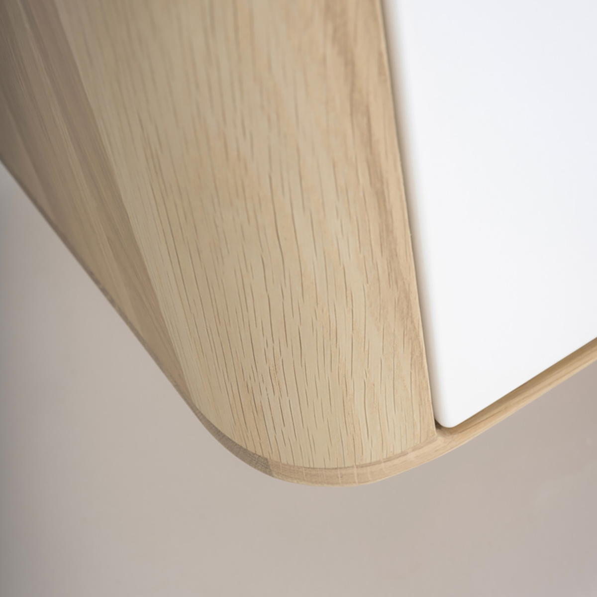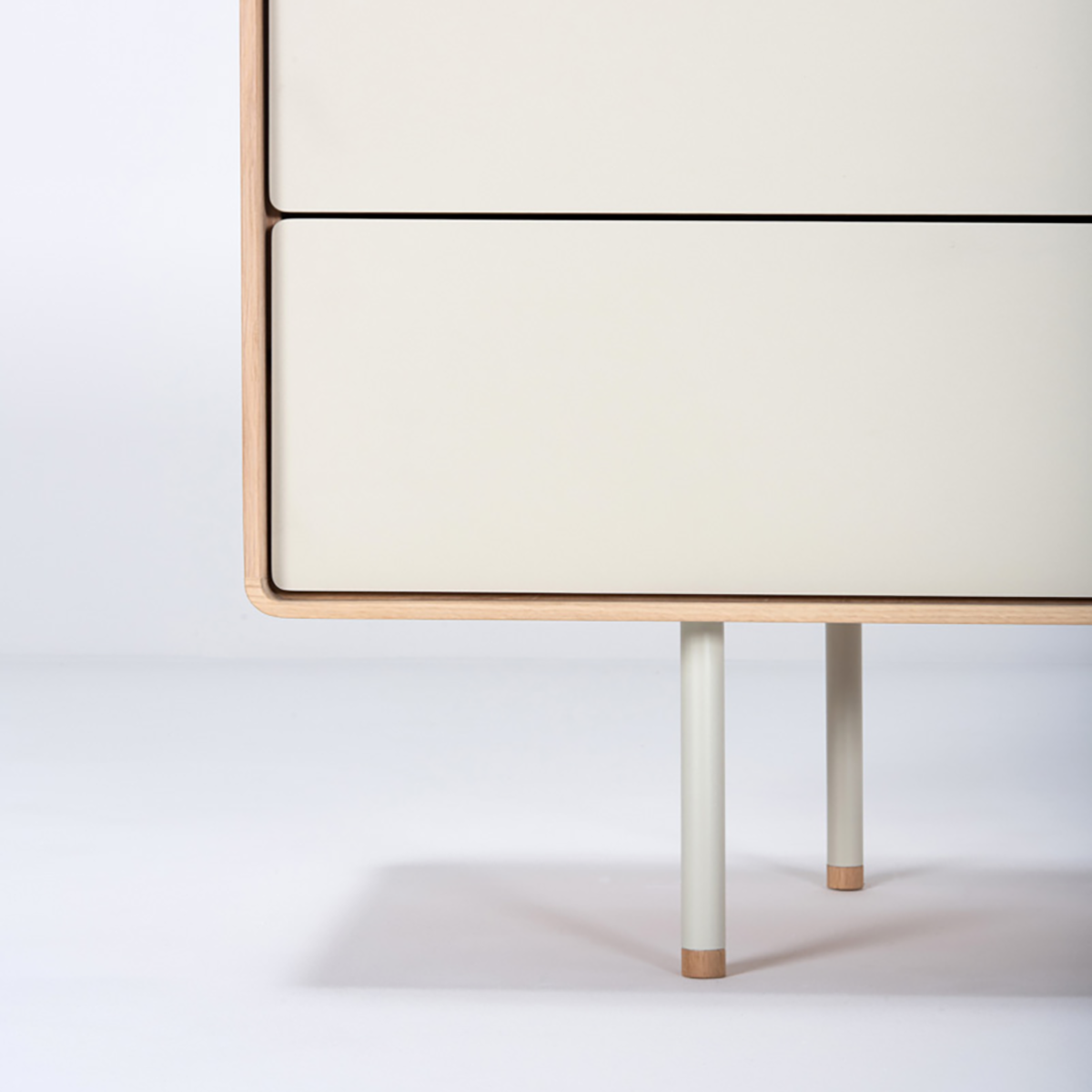 De Gazzda Fawn Dresser is een massief eikenhouten opbergkast die door de afgeronde hoeken een klassieke look krijgt. Deze opbergkast is ook te gebruiken als commode. De afgeronde hoeken en het prachtig afgewerkte eikenhout zorgen voor de warme uitstraling van de Fawn Dresser. De opbergkast heeft drie lades en twee deurtjes, allemaal met het soft-close systeem. Dit zorgt ervoor dat de lades en kastjes geleidelijk sluiten. Achter het linker en rechter deurtje zit aan beide kanten twee planken die in hoogte verstelbaar zijn. Hierdoor is er genoeg opbergruimte voor je spullen.