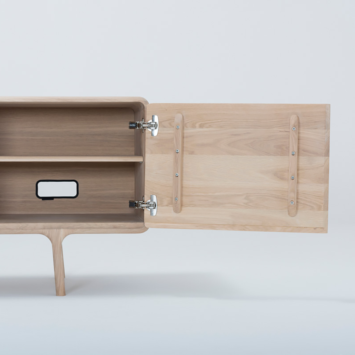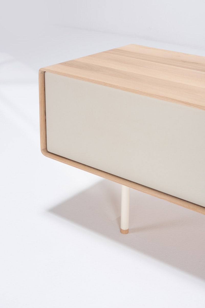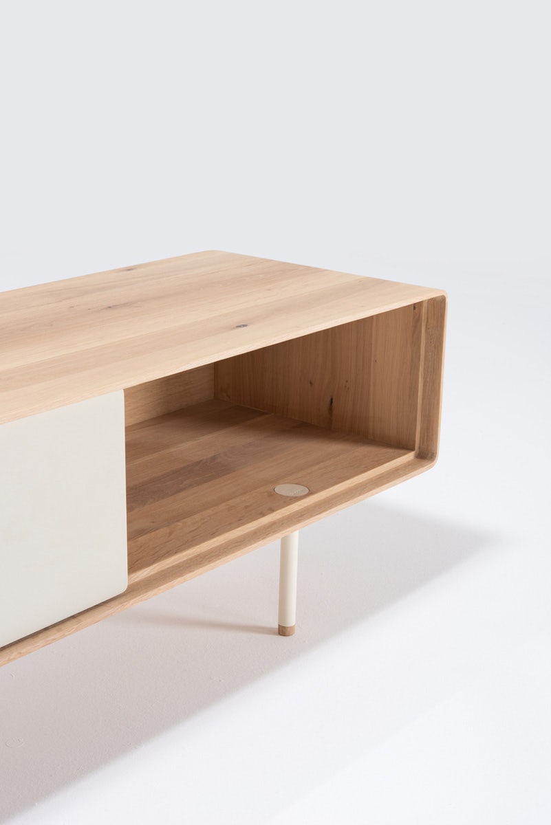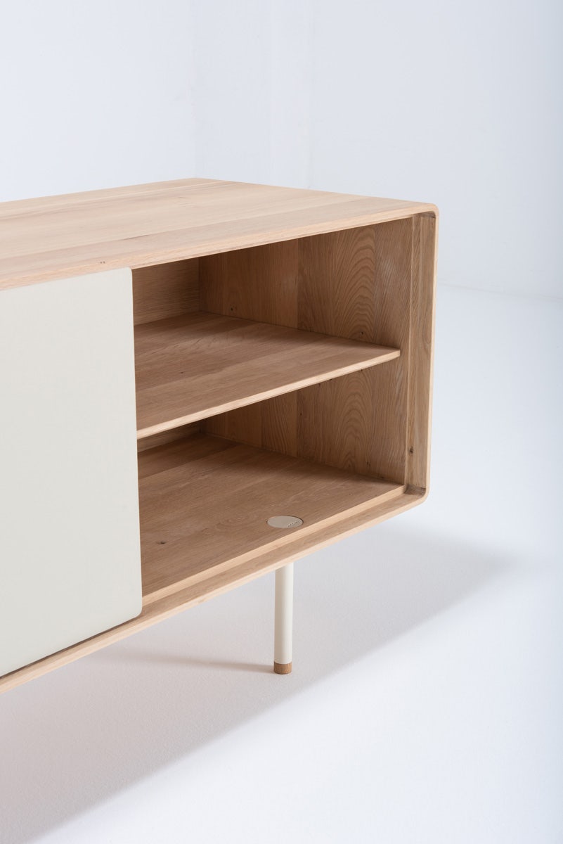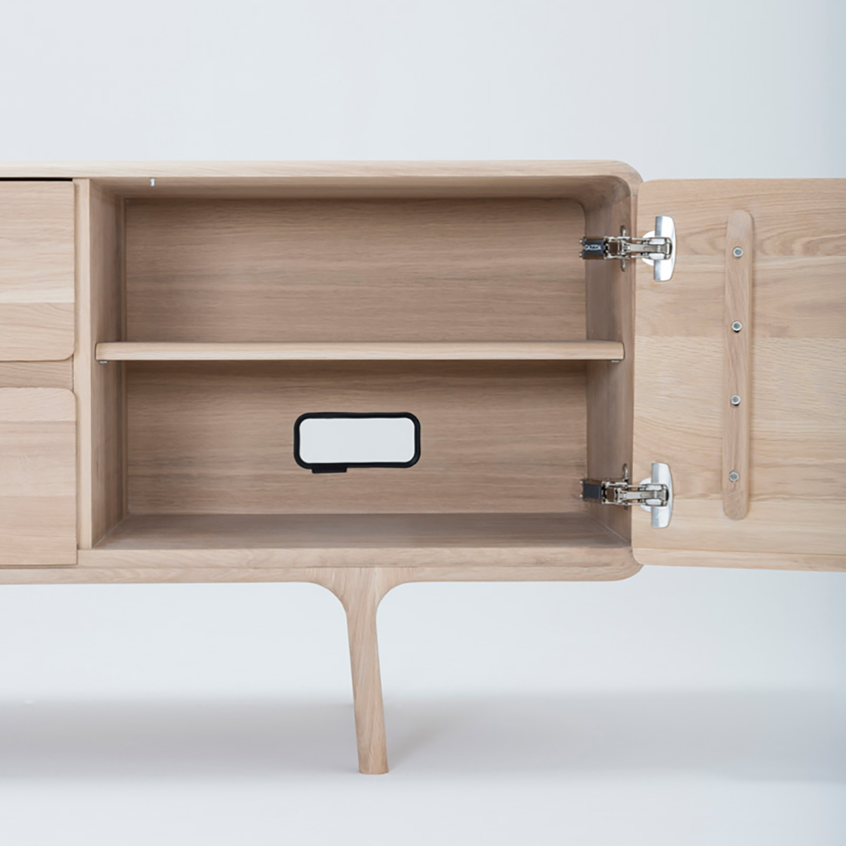 Het Fina sideboard van Gazzda is multifuctioneel. Je kunt dit moderne dressoir gebruiken als ieder ander dressoir maar het is ook mogelijk om dit dressoir in te zetten als Tv-meubel. Het kabelgat in de achterwand zorgt ervoor dat je met gemak alle kabels netjes wegwerkt. Alle televisieaccessoires en andere spulletjes kun je opbergen in de twee lades en in het onderste open vak. De lades zijn bekleed met linoleum voor een modern uiterlijk. Voordelen Gemaakt van massief eikenhout Lades zijn bekleed met mushroom kleur linoleum Met hoge kwaliteit afgewerkt waardoor je er jaren plezier van hebt Voldoende opbergplek voor al je spullen Een soft close sluiting en push to open mechanisme om het deurtje te openen Gazzda heeft voor het onderhoud een speciaal Care & Repair set verkrijgbaar