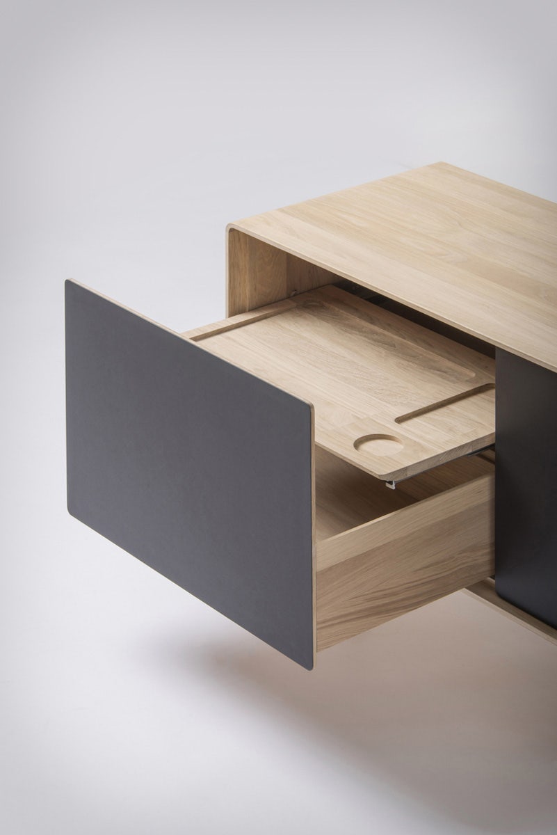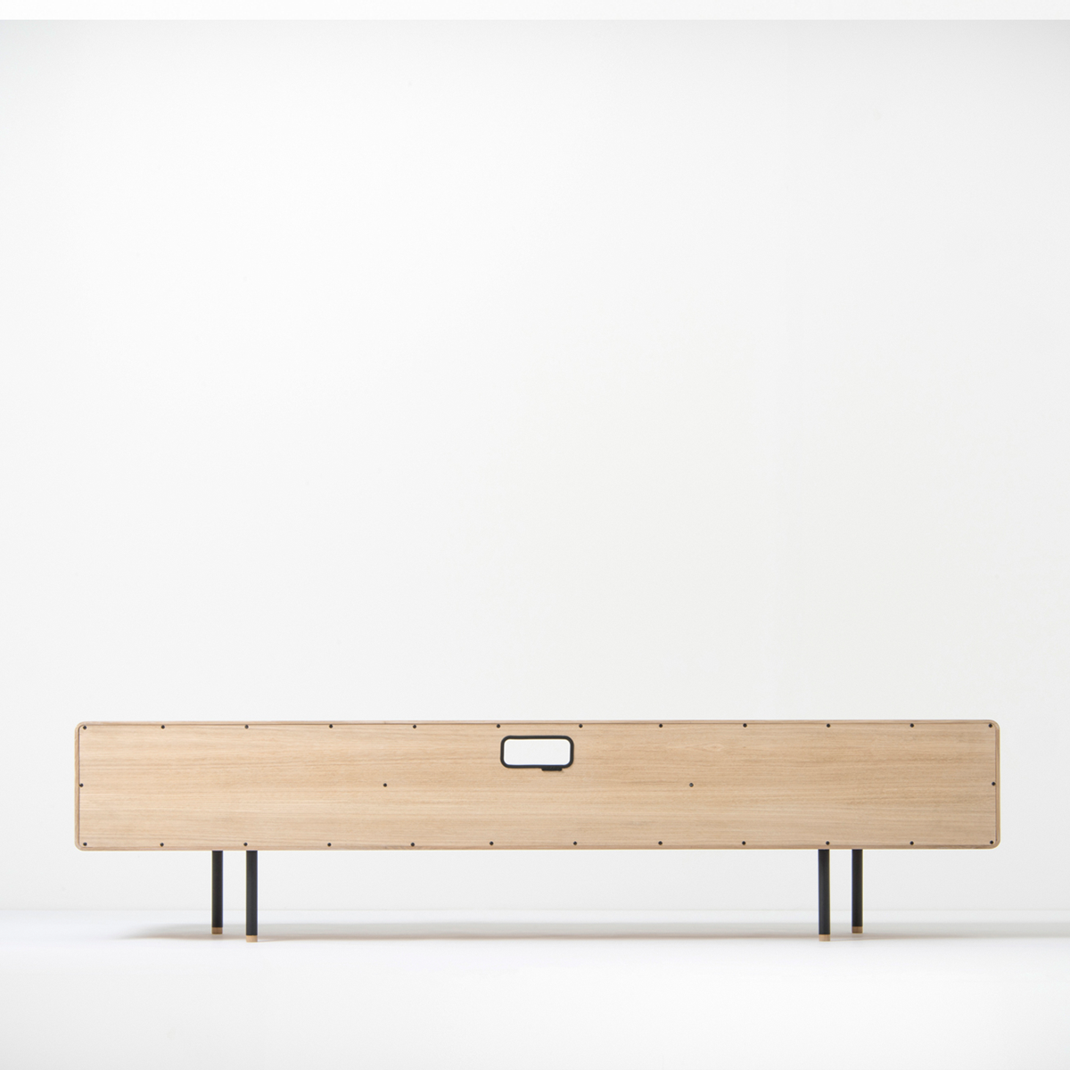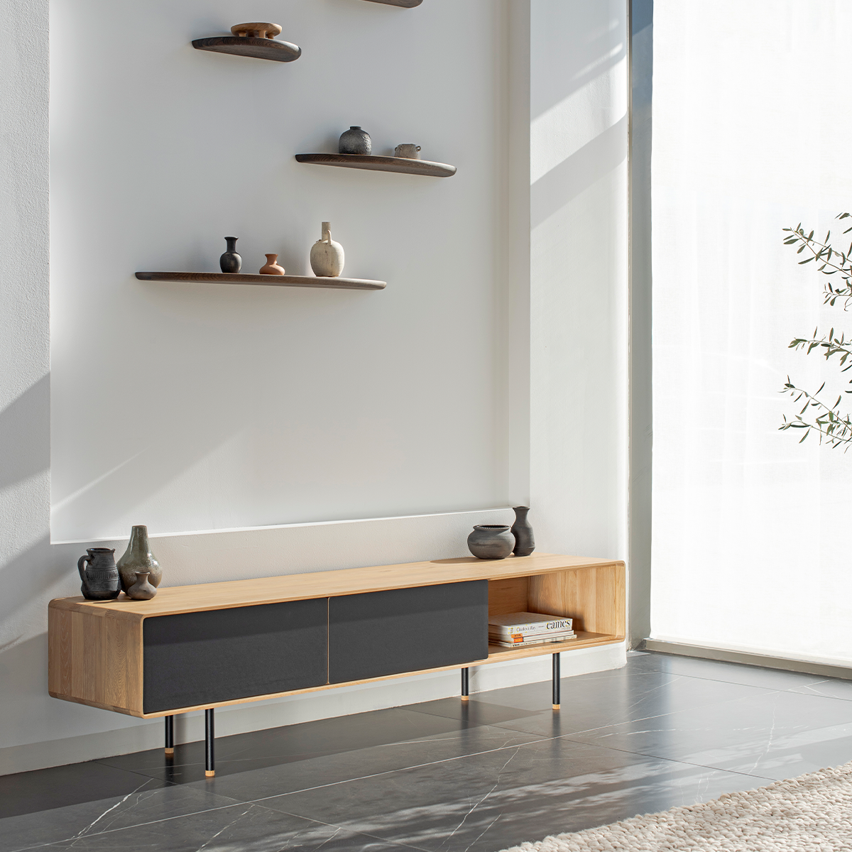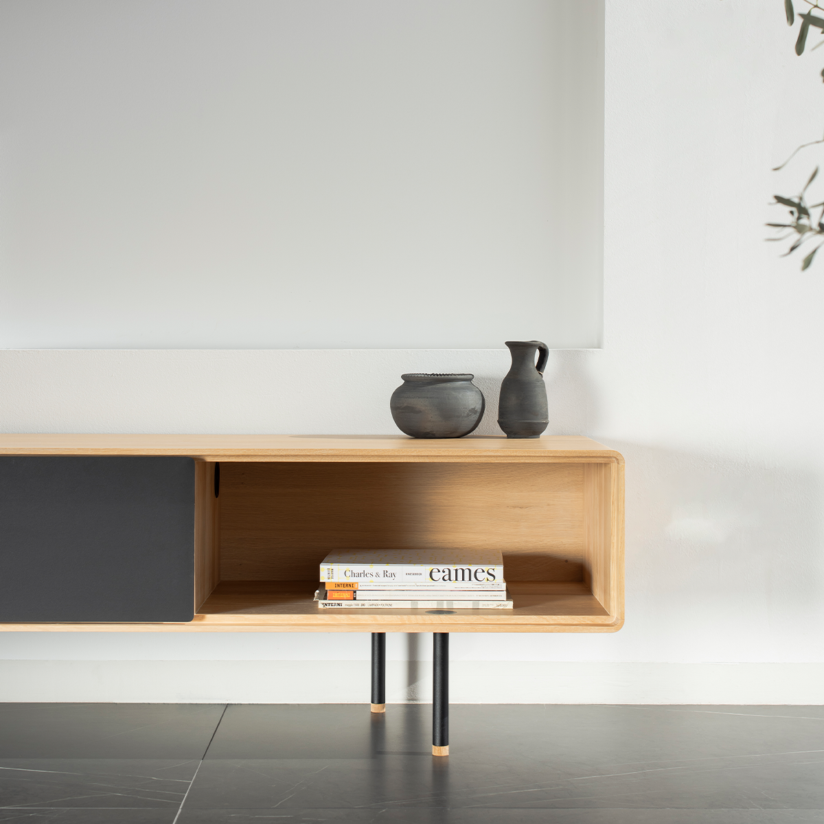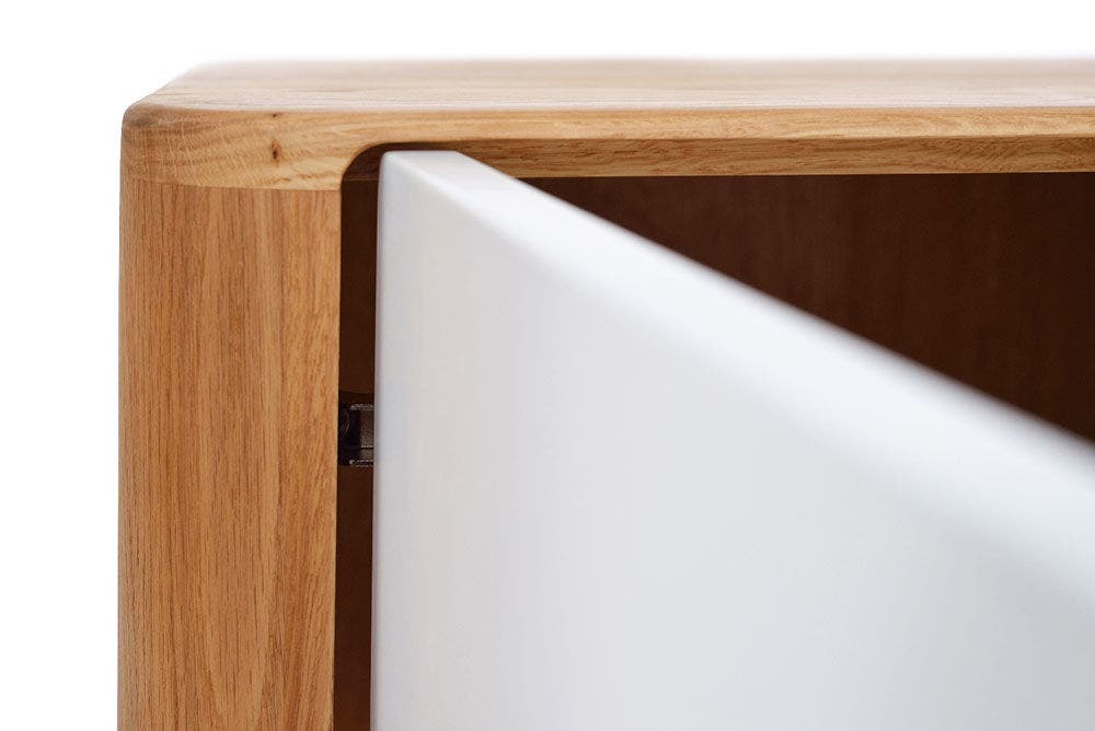 Het Fina sideboard van Gazzda is multifuctioneel. Je kunt dit moderne dressoir gebruiken als ieder ander dressoir maar het is ook mogelijk om dit dressoir in te zetten als Tv-meubel. Het kabelgat in de achterwand zorgt ervoor dat je met gemak alle kabels netjes wegwerkt. Alle televisieaccessoires en andere spulletjes kun je opbergen in de twee lades en in het onderste open vak. De lades zijn bekleed met linoleum voor een modern uiterlijk. Voordelen Gemaakt van massief eikenhout Lades zijn bekleed met mushroom kleur linoleum Met hoge kwaliteit afgewerkt waardoor je er jaren plezier van hebt Voldoende opbergplek voor al je spullen Een soft close sluiting en push to open mechanisme om het deurtje te openen Gazzda heeft voor het onderhoud een speciaal Care & Repair set verkrijgbaar