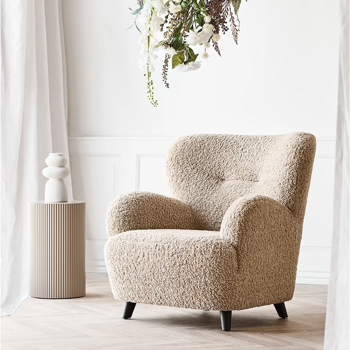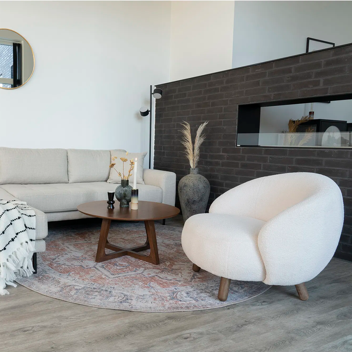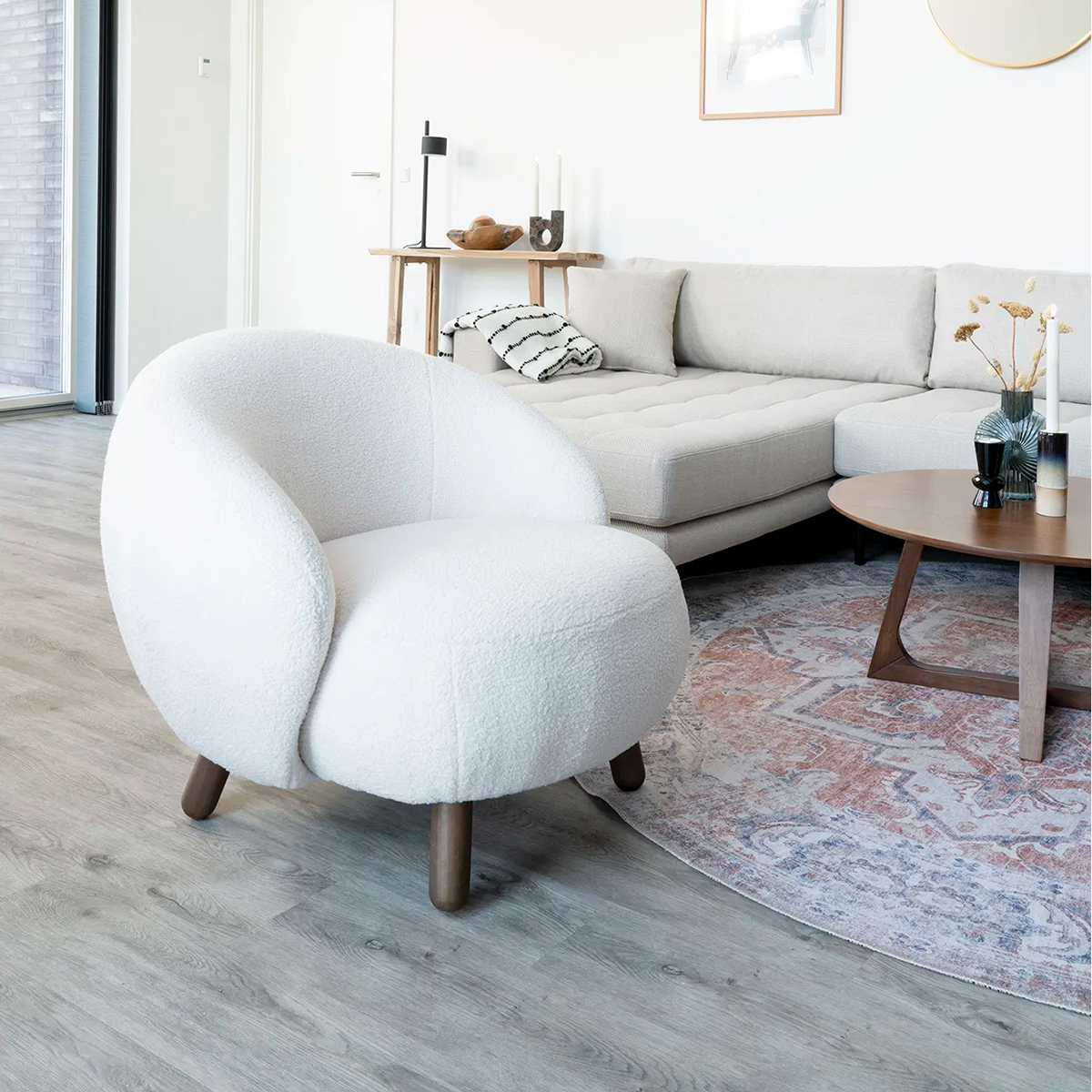 De Mona fauteuil van Artichok is een fauteuil in op en top Scandinavische stijl. Deze ronde fauteuil heeft een opvallend design dat helemaal aansluit bij de woontrend van organische vormen. In combinatie met de teddystof bekleding zorgt dit ervoor dat de fauteuil stoel een zachte, warme en rustgevende uitstraling heeft. De walnootkleurige houten poten vormen een mooi contrast met de frisse witte teddystof. Het trendy design van deze fauteuil zorgt ervoor dat je interieur direct een upgrade krijgt. Combineer deze organische fauteuil met een leuk bijzettafeltje in bijzondere vorm of kleur en je bent helemaal klaar om heerlijk op deze stoel te loungen. Of je nu films en series wilt kijken of gewoon wilt wegkruipen in een goed boek, met de Mona fauteuil doe je dat altijd in stijl. Voordelen en tips Teddystof fauteuil Ontworpen met houten poten in walnoot kleur Deze fauteuil past perfect bij de woontrend van organische