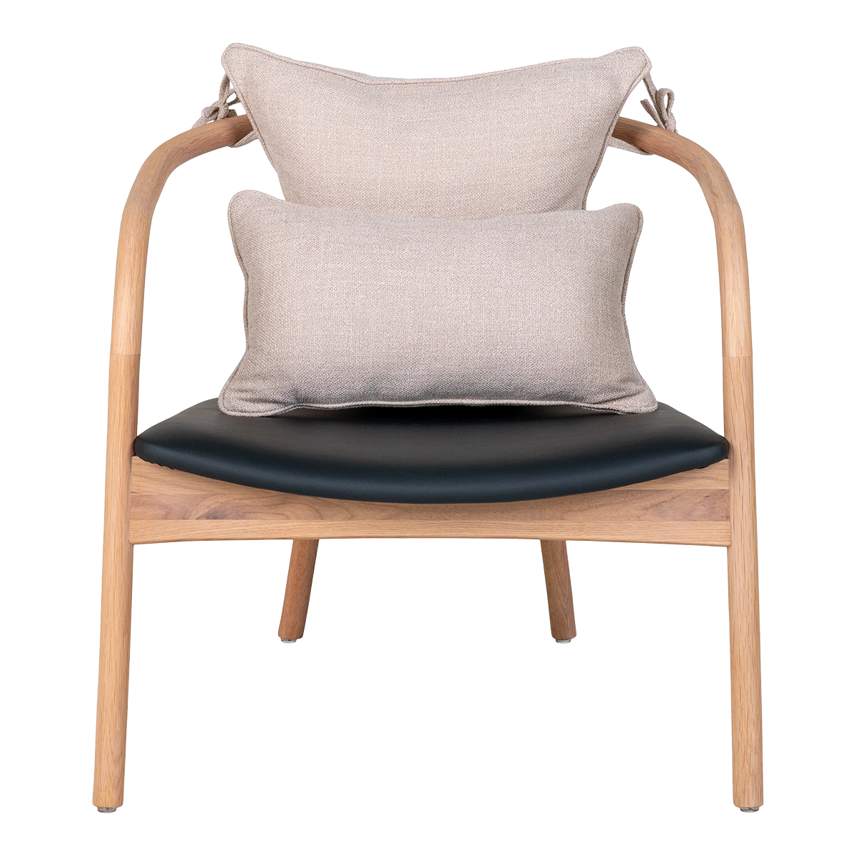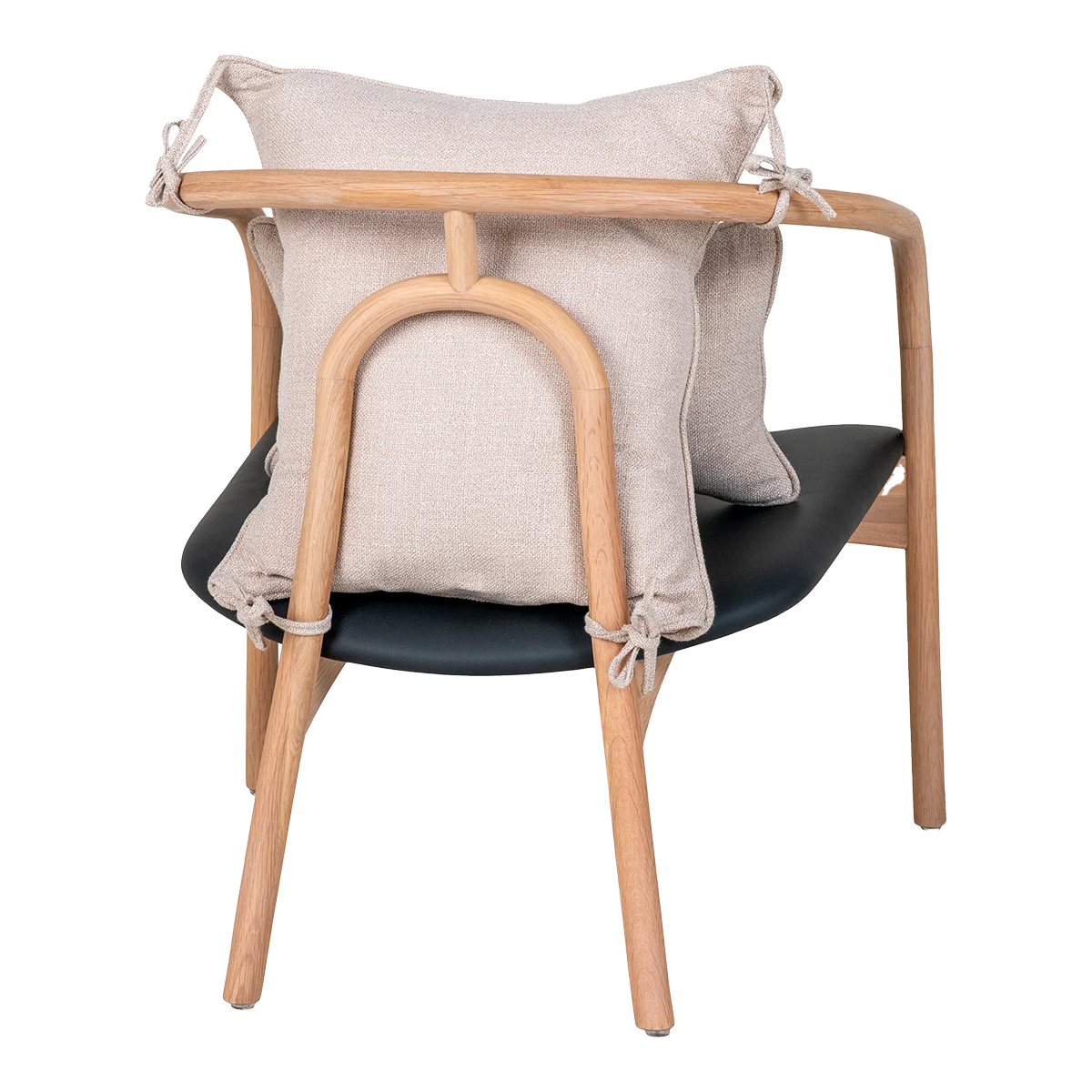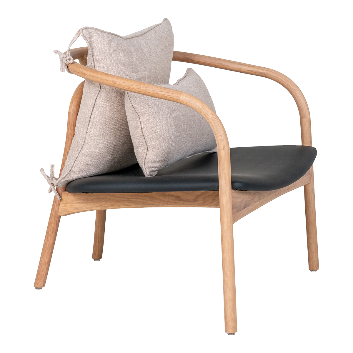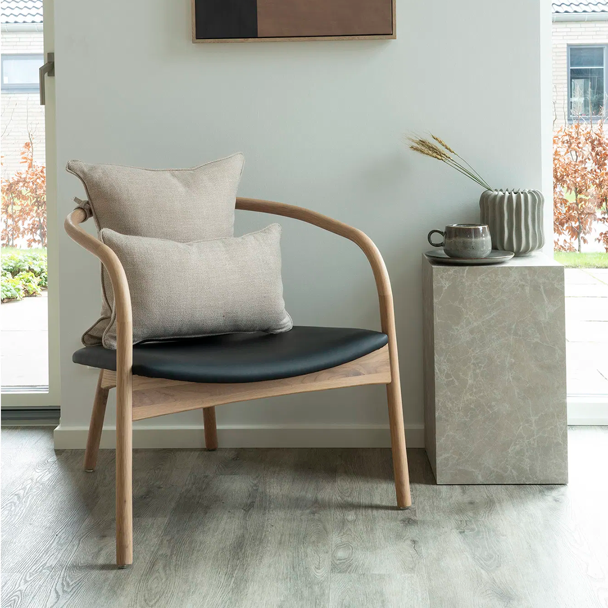 De Kasper eikenhouten fauteuil van Artichok hult de ruimte in een Scandinavische sfeer. Met een natuurlijk eikenhouten frame en een zitvlak van leer, is deze fauteuil een perfecte mix van elegantie en comfort. De fauteuil is ontworpen met armleuningen voor extra comfort, en ook de twee zachte kussens met beige stoffen bekledign dragen bij aan het zitocmfort. Deze kleine fauteuil heeft prachtige ronde vormen, die in combinatie met de natuurlijke houtkleur zorgen voor een op en top Scandinavische uitstraling. Dankzij de kunstleren zitting krijgt het product een moderne twist en is deze fauteuil stoel in verschillende woonstijlen een goede match.  Voordelen Ronde houten fauteuil Het frame is volledig gemaakt van eikenhout Het zwarte kunstleren zitkussen geeft het design een moderne touch De fauteuil heeft armleuningen voor extra comfort Inclusief twee beige kussens die ondersteuning bieden aan de
