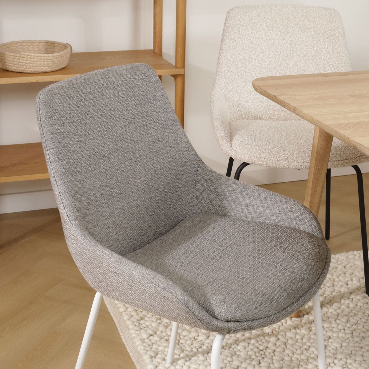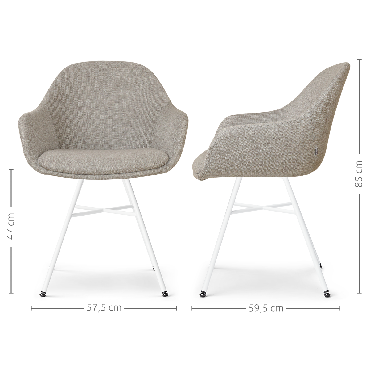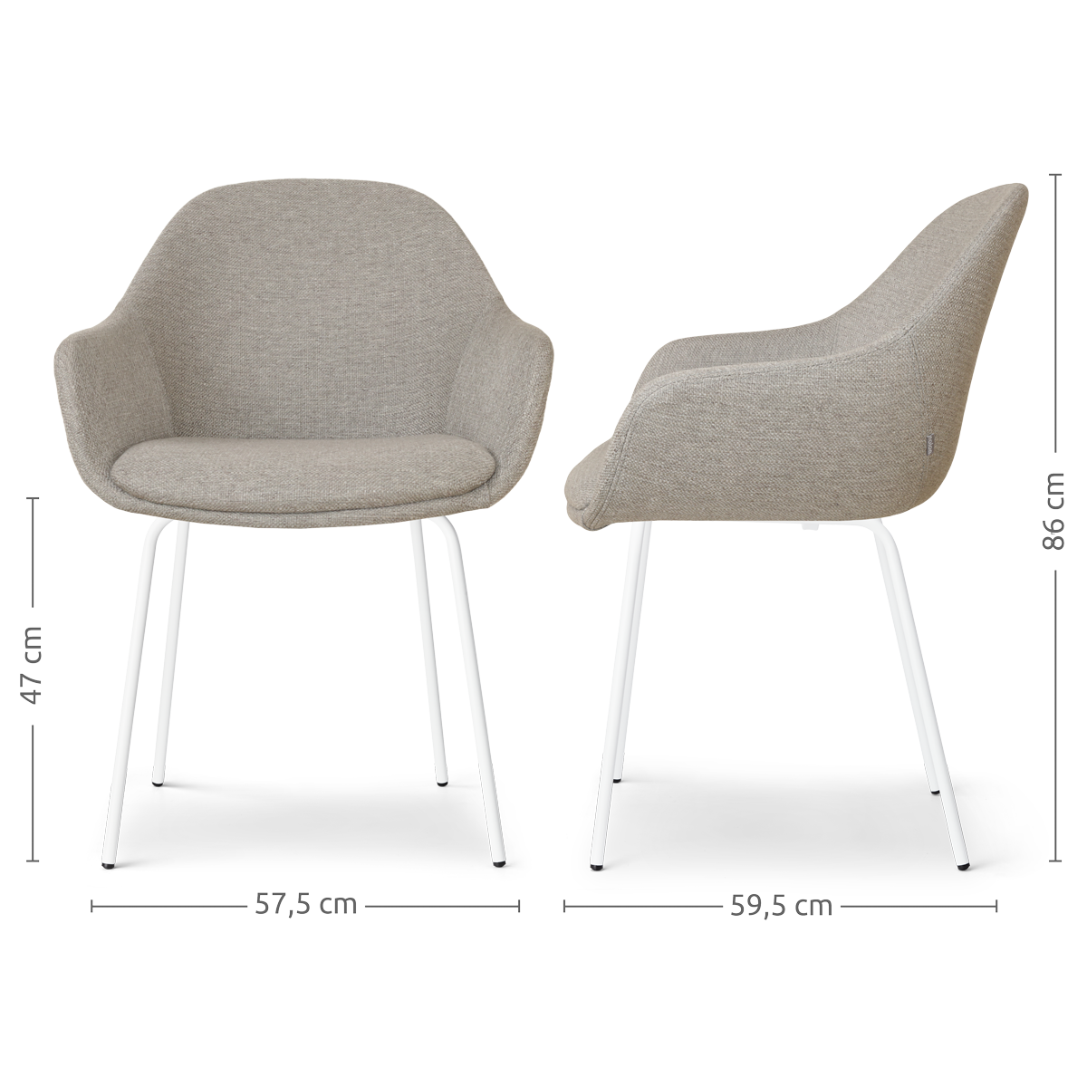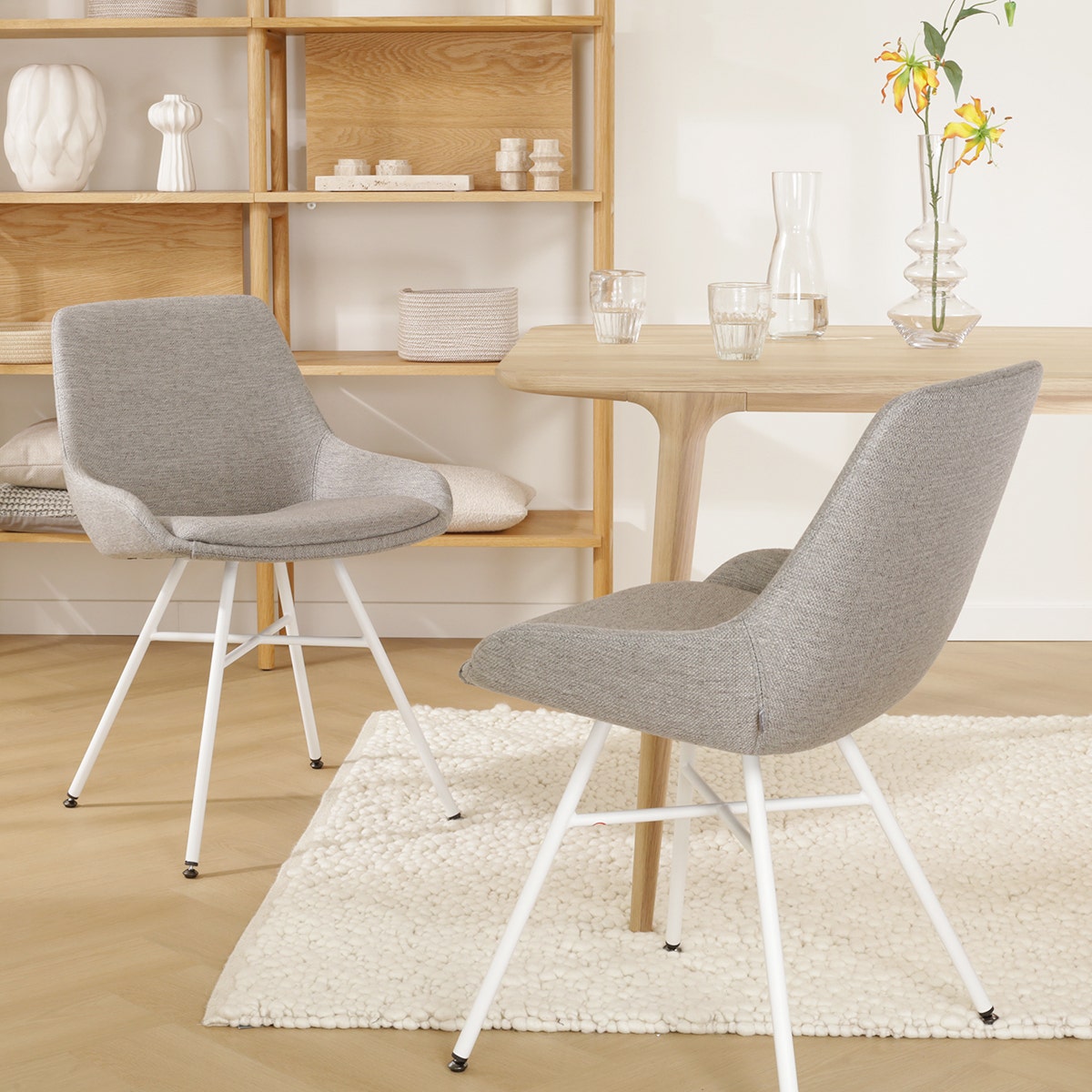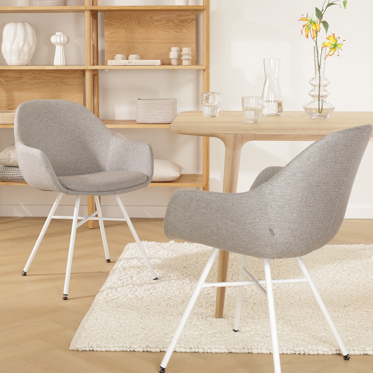 Stijlvol en modern: de Nora-Mae eetkamerstoel in warm grijs. Met de Nora-Mae eetkamerstoel haal je een combinatie van luxe en Scandinavisch design in huis. Deze eetkamerstoel in warm grijs met witte metalen poten straalt niet alleen elegantie uit, maar biedt ook optimaal zitcomfort. De gestoffeerde zitting heeft zachte, afgeronde vormen en is voorzien van comfortabele armleuningen, ideaal voor lange diners of gezellige gesprekken. Het strakke onderstel zorgt voor een stabiele basis, terwijl het minimalistische ontwerp perfect aansluit bij een modern interieur. De Nora-Mae is verkrijgbaar in diverse kleuren en materialen, zodat je altijd een variant vindt die past bij jouw persoonlijke stijl. De hoogwaardige stoffen bekleding voelt zacht aan en geeft de stoel een warme uitstraling. Het stevige houten binnenwerk van de zitting zorgt voor langdurige ondersteuning, terwijl de ergonomische vormgeving bijdraagt aan een ontspannen zithouding. Of je nu kiest voor een set of