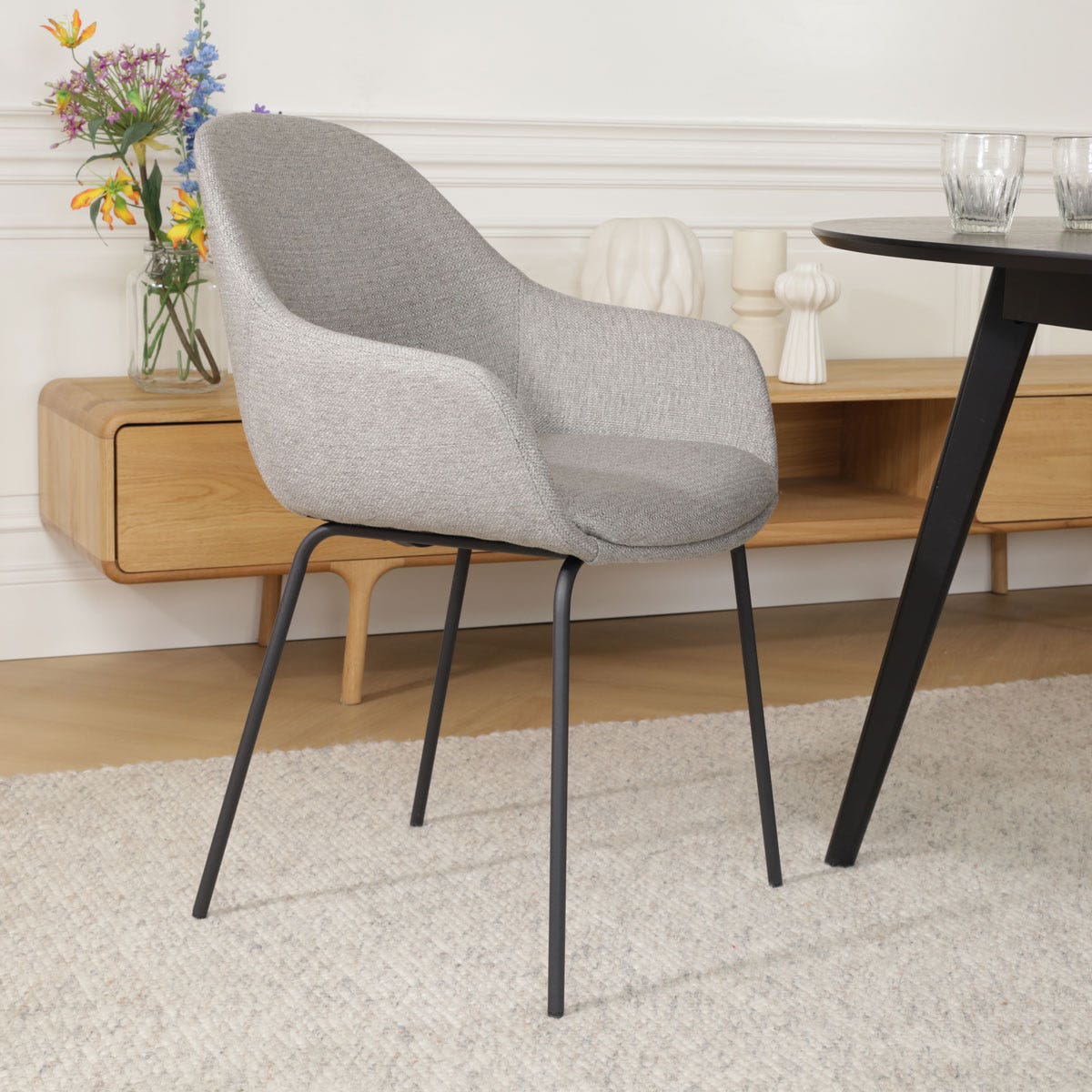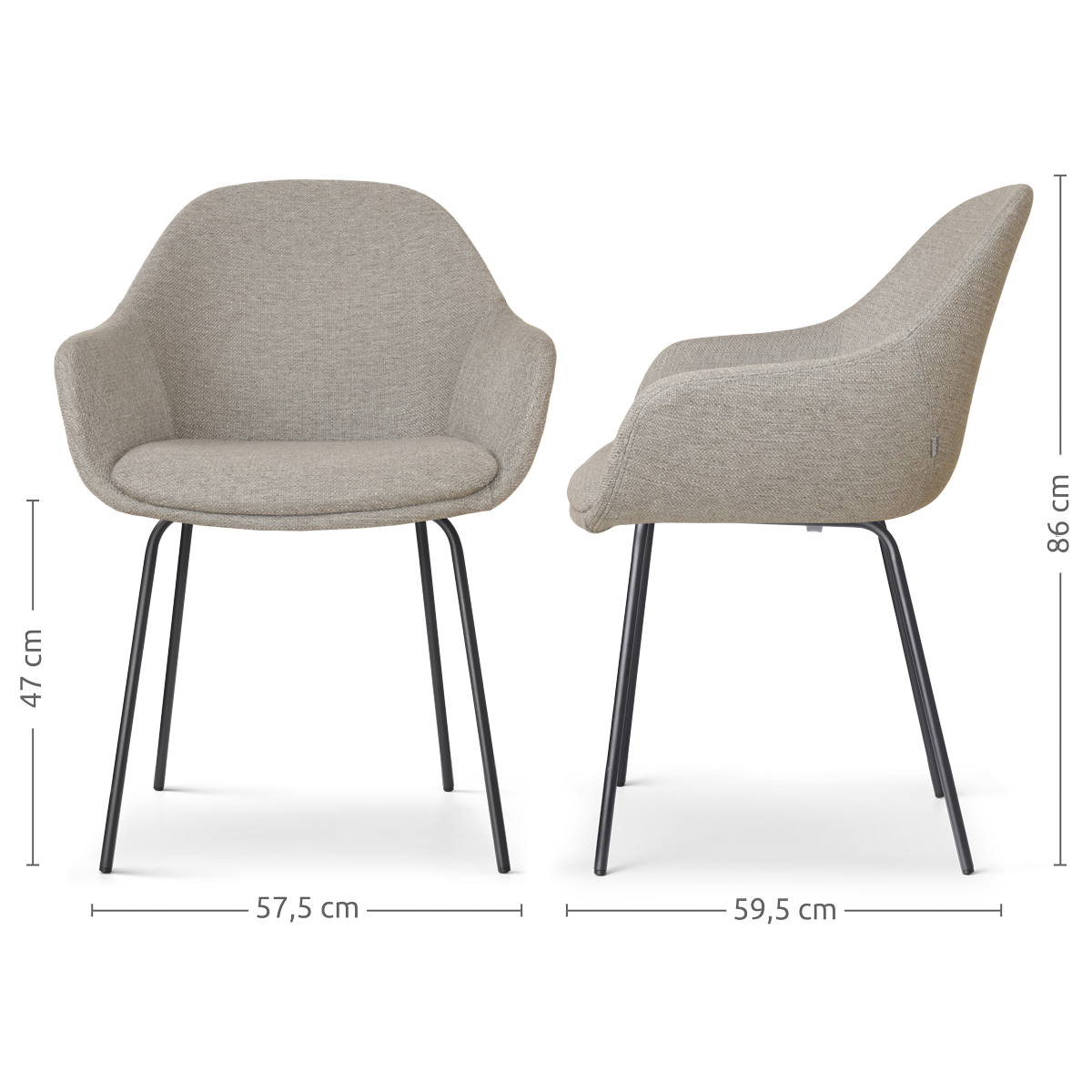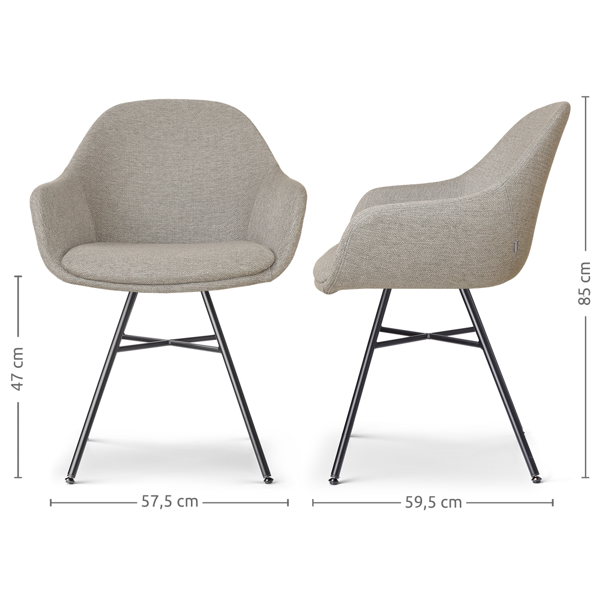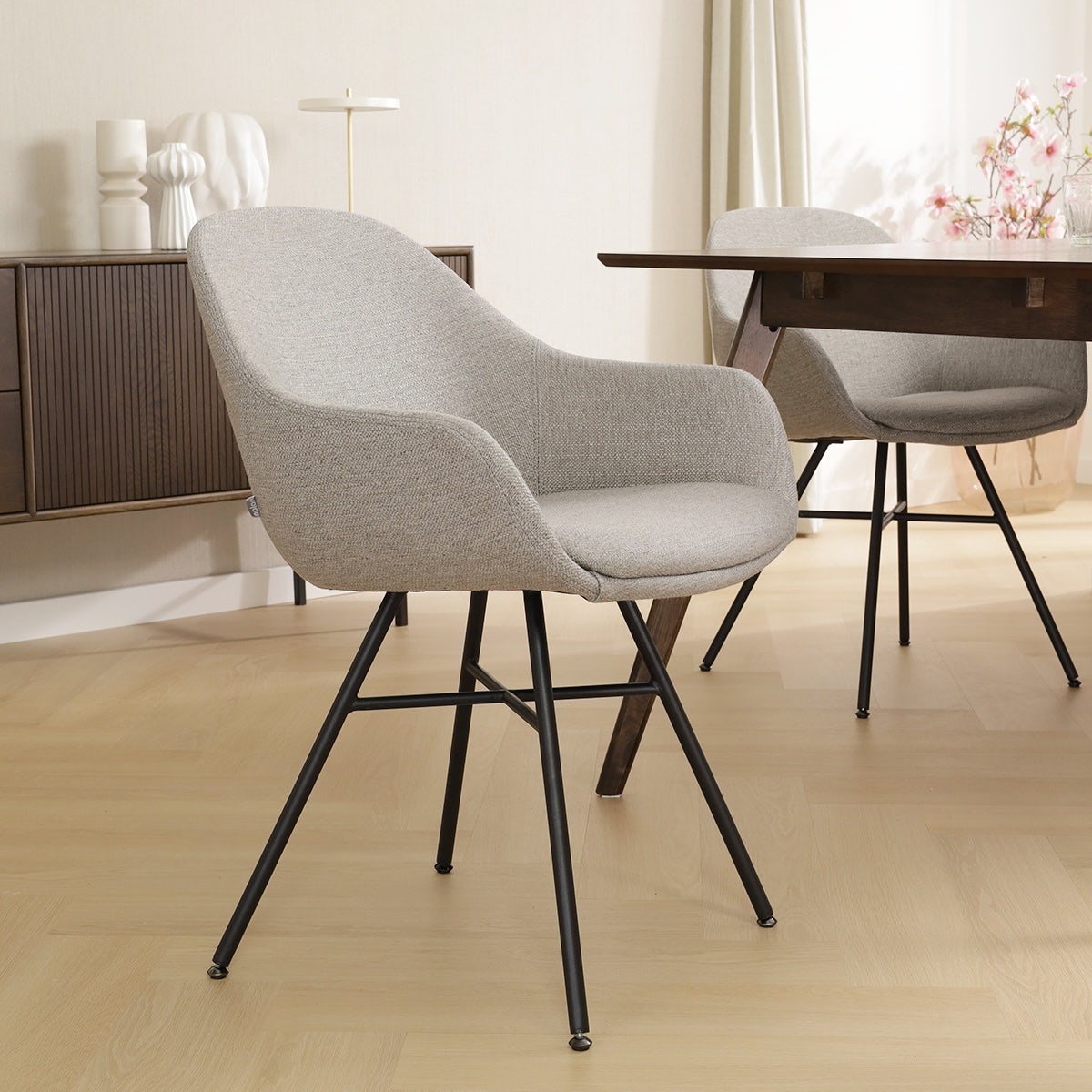 Grijze eetkamerstoel met armleuningen en zwarte poten. De grijze eetkamerstoel met zwarte poten Noa-Mae van Nolon is het perfecte voorbeeld van hoe comfort en stijl gecombineerd kunnen worden. Deze stoel heeft een zitting met luxe stoffen bekleding in een warm grijze tint. De zitting heeft een zacht zitvlak, schuin aflopende armleuningen en afgeronde vormen. Deze comfortabele stoffen zitting is gecombineerd met een modern metalen onderstel. De zwarte poten zijn voorzien van een kruisverbinding voor extra stabilteit, en hebben daarnaast verstelbare voetpootjes. Het ontwerp van de Noa-Mae straalt luxe uit dankzij de hoogwaardige materialen en subtiele rondingen. De warme grijstint van de zitting vormt een perfect contrast met de zwarte poten, wat de stoel geschikt maakt voor zowel een moderne als industriële woonstijl. Voor welk interieur je ook kiest, deze stoffen eetkamerstoel met zwarte poten past overal bij. Tips voor onderhoud en langere