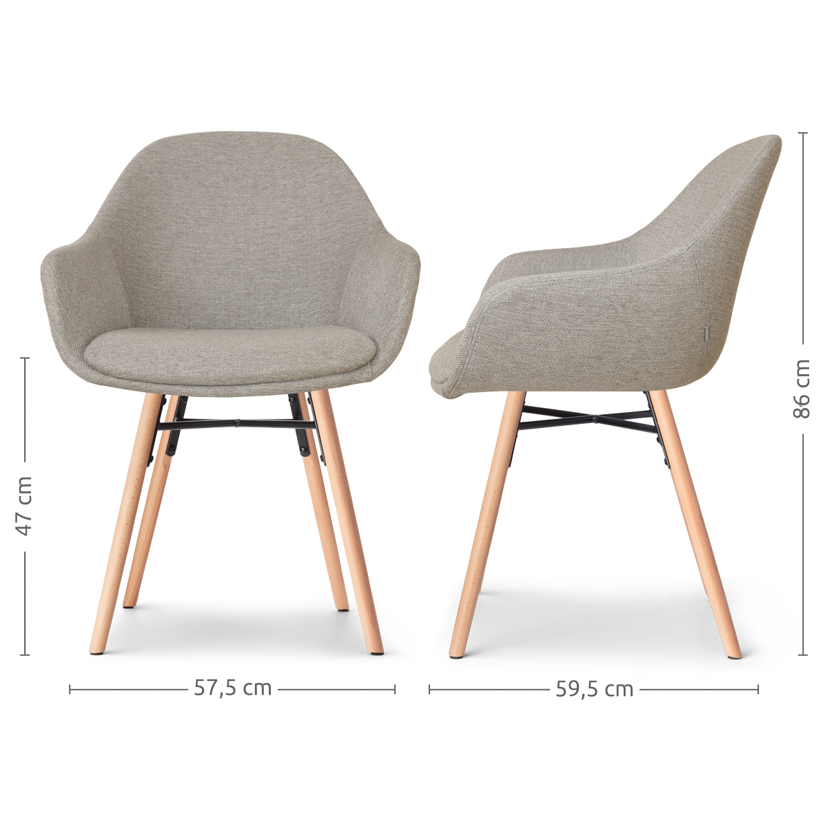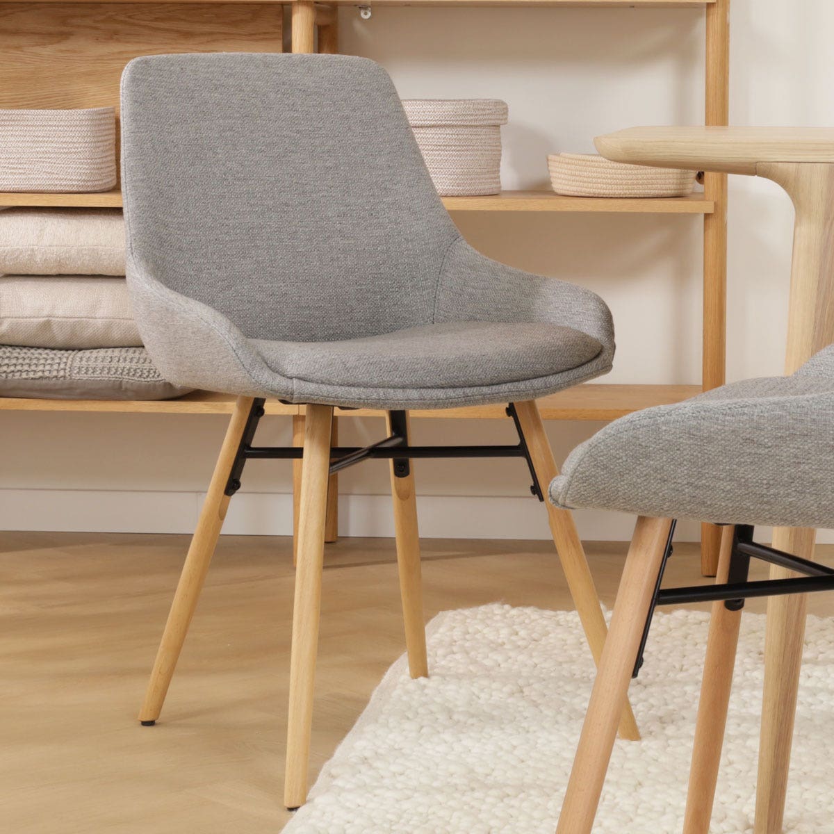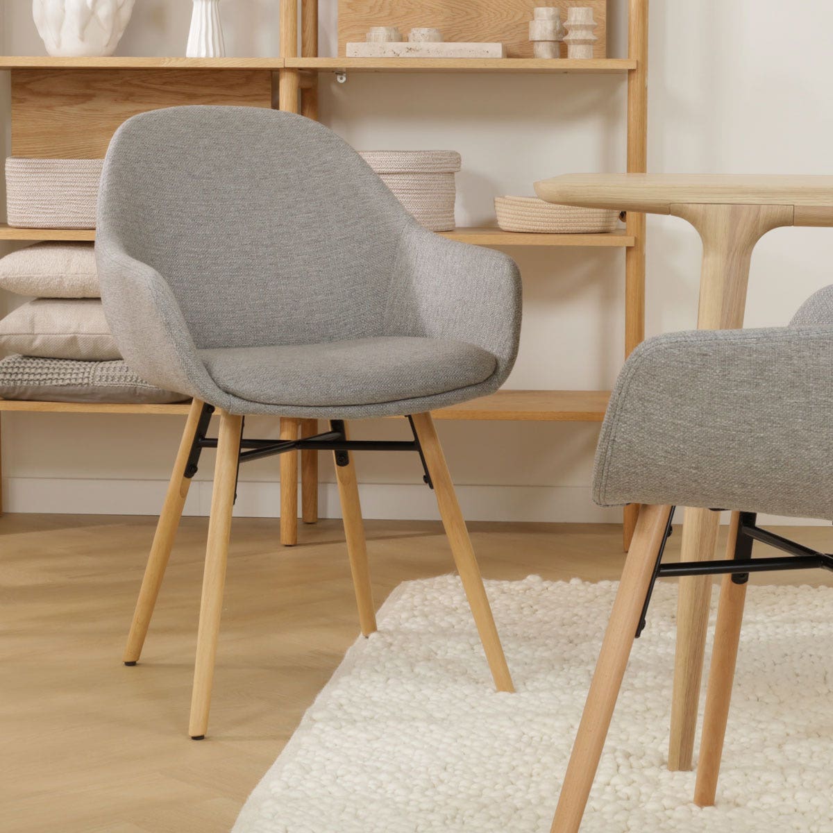 Stijlvolle Scandinavische eetkamerstoel - warm grijs met houten poten. De Nena-Mae eetkamerstoel in warm grijs is een perfecte combinatie van modern Scandinavisch design en tijdloze elegantie. Met zijn comfortabele kuipzitting en armleuningen nodigt deze stoel uit om urenlang te tafelen. De zachte stoffering in een luxe afwerking zorgt niet alleen voor een prettig zitgevoel, maar geeft ook een warme uitstraling aan je eetkamer. De beukenhouten poten in een naturel tint voegen een natuurlijke en rustieke touch toe, terwijl de stevige metalen kruisverbinding extra stabiliteit biedt. Dankzij de ergonomische vorm van de zitting en de aflopende armleuningen biedt de Nena-Mae optimale ondersteuning en comfort. Dit maakt de stoel niet alleen praktisch, maar ook stijlvol. Of je nu een modern of meer klassiek Scandinavisch interieur hebt, de veelzijdige uitstraling van de Nena-Mae past overal bij. Onderhoudstips voor langdurige schoonheid Met deze eenvoudige