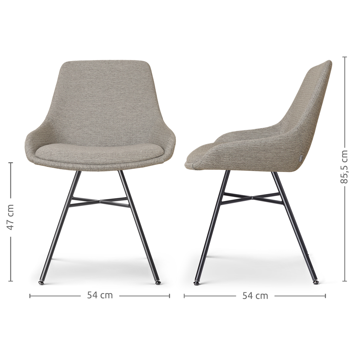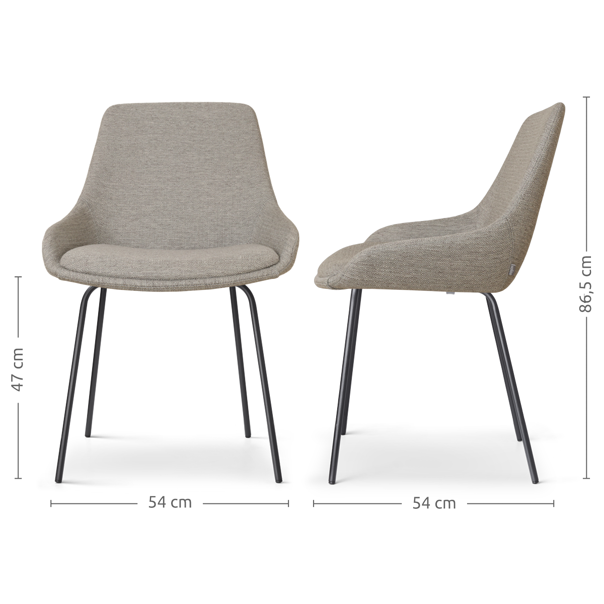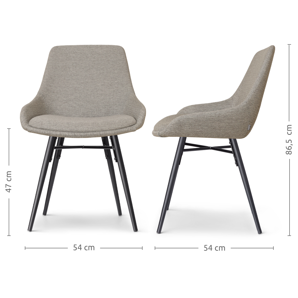 Verrijk jouw eetkamer met de Nora-Isa eetkamerstoel in warm grijs met een zwart metalen onderstel van het merk Nolon.Deze stoel, ontworpen in een moderne Scandinavische stijl, biedt een perfecte balans tussen elegantie en functionaliteit. De zitting is volledig gestoffeerd en voorzien van een stevig houten binnenwerk, wat een comfortabele en actieve zithouding bevordert. Met een zithoogte van 47 cm en een zitdiepte van 40 cm, past de stoel perfect onder elke tafel dankzij het ontbreken van armleuningen. Het minimalistische ontwerp van het zwarte metalen onderstel voegt een eigentijdse uitstraling toe, terwijl de stoel eenvoudig en snel in elkaar te zetten is. Ideaal voor elke eetkamer, deze stoel is niet alleen praktisch maar ook een stijlvolle toevoeging aan je interieur. De Nora-Isa eetkamerstoel is 86,5 cm hoog en biedt veelzijdigheid met zijn moderne ontwerp en hoogwaardige materialen. Onderhoud en advies Aangeraden wordt om de stoffen