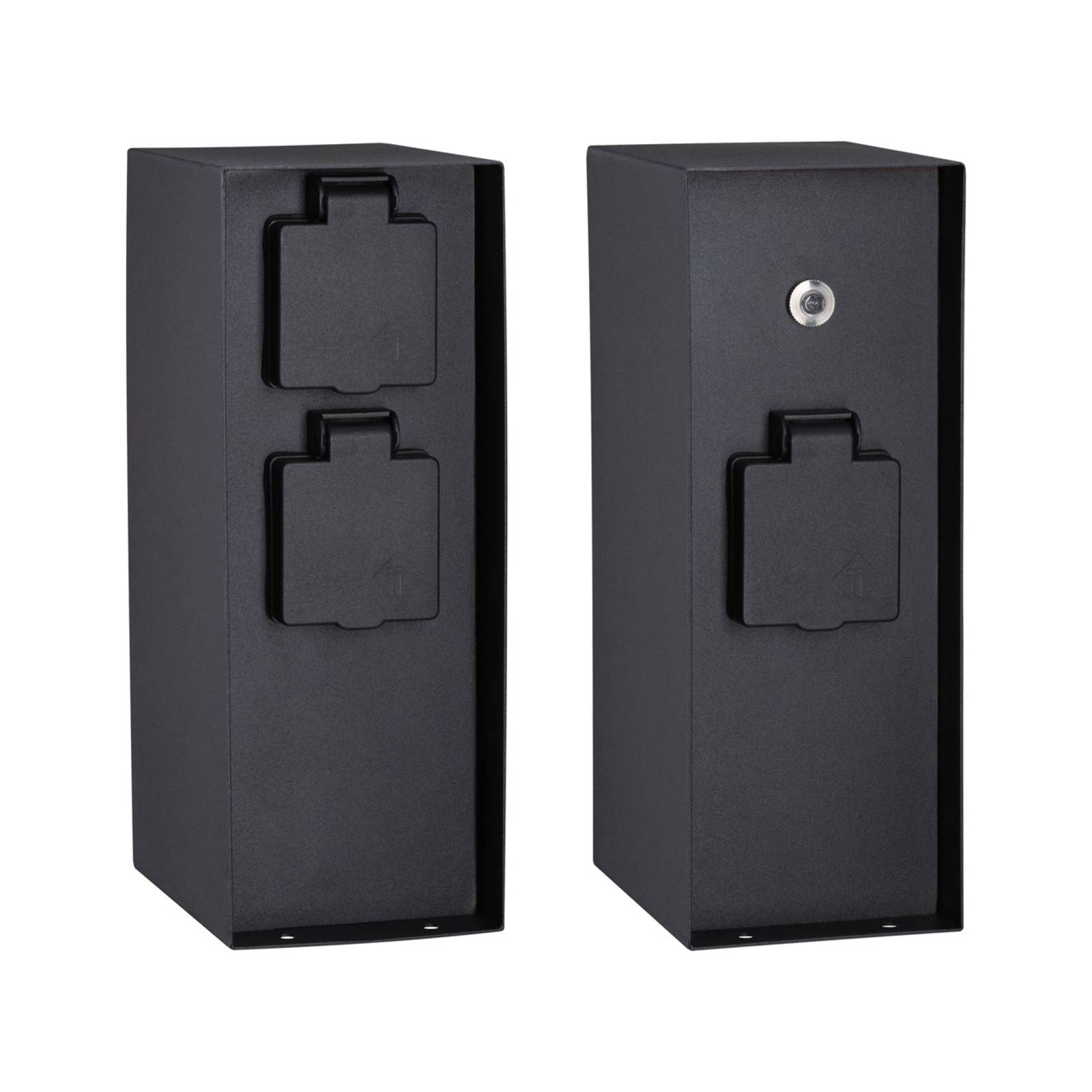 Antracietkleurige stekkerdoos Rio met twee geaarde stopcontacten De stekkerdoos Rio is gemaakt van antracietkleurig gecoat metaal en biedt met twee geaarde stopcontacten aansluitmogelijkheden voor elektrische apparaten of verlichting in buitenruimtes.