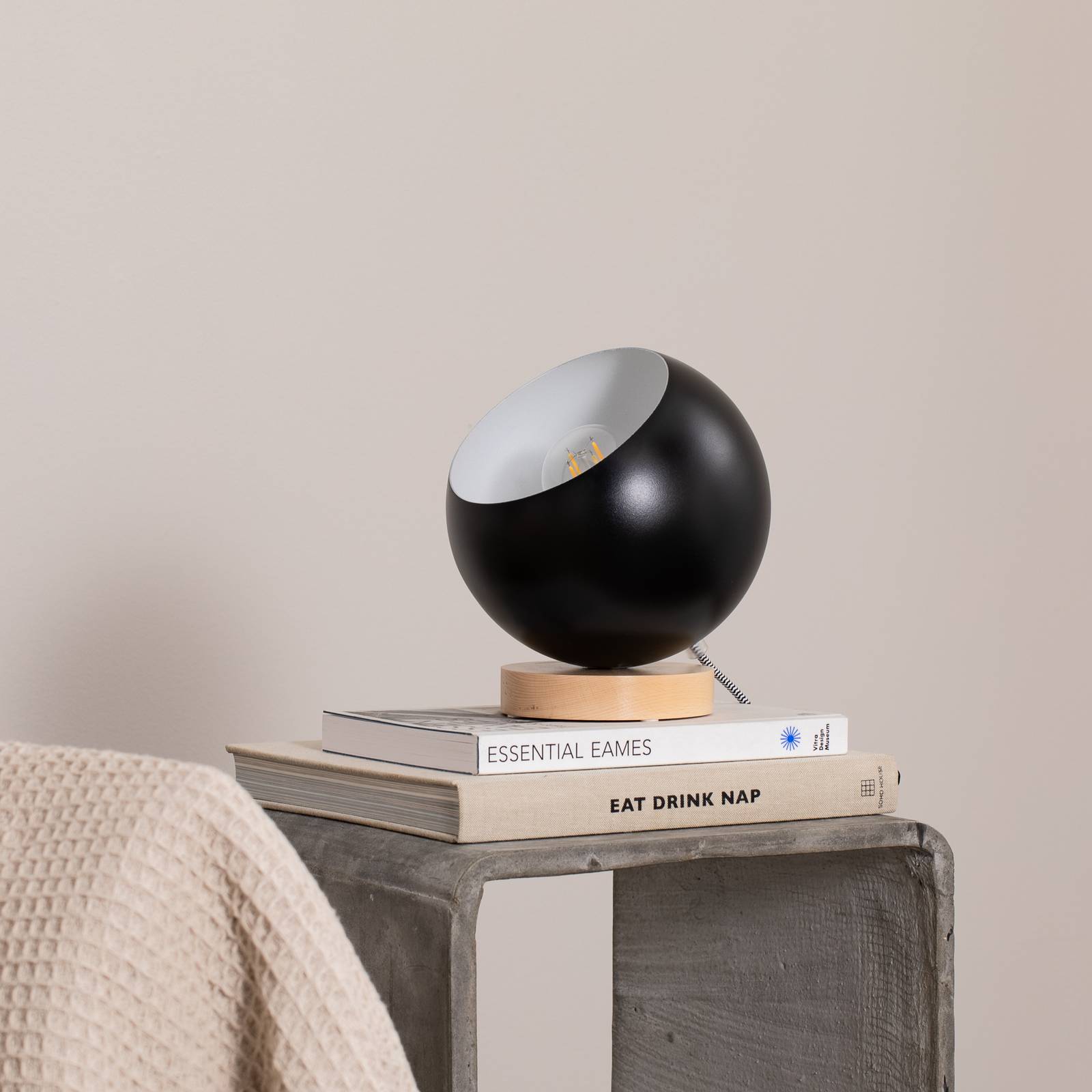 Arvid tafellamp met zwarte bolvormige kap De Arvid tafellamp, vervaardigd in Europa, is een moderne extra lichtbron met een Natur touch voor dressoirs en nachtkastjes. De kap is direct geplaatst op een kleine, ronde voet van eikenhout. Deze bestaat uit een zwart gelakte bol van staal, die is voorzien van een schuine lichtuitstraling naar boven en waarin zich een fitting bevindt.