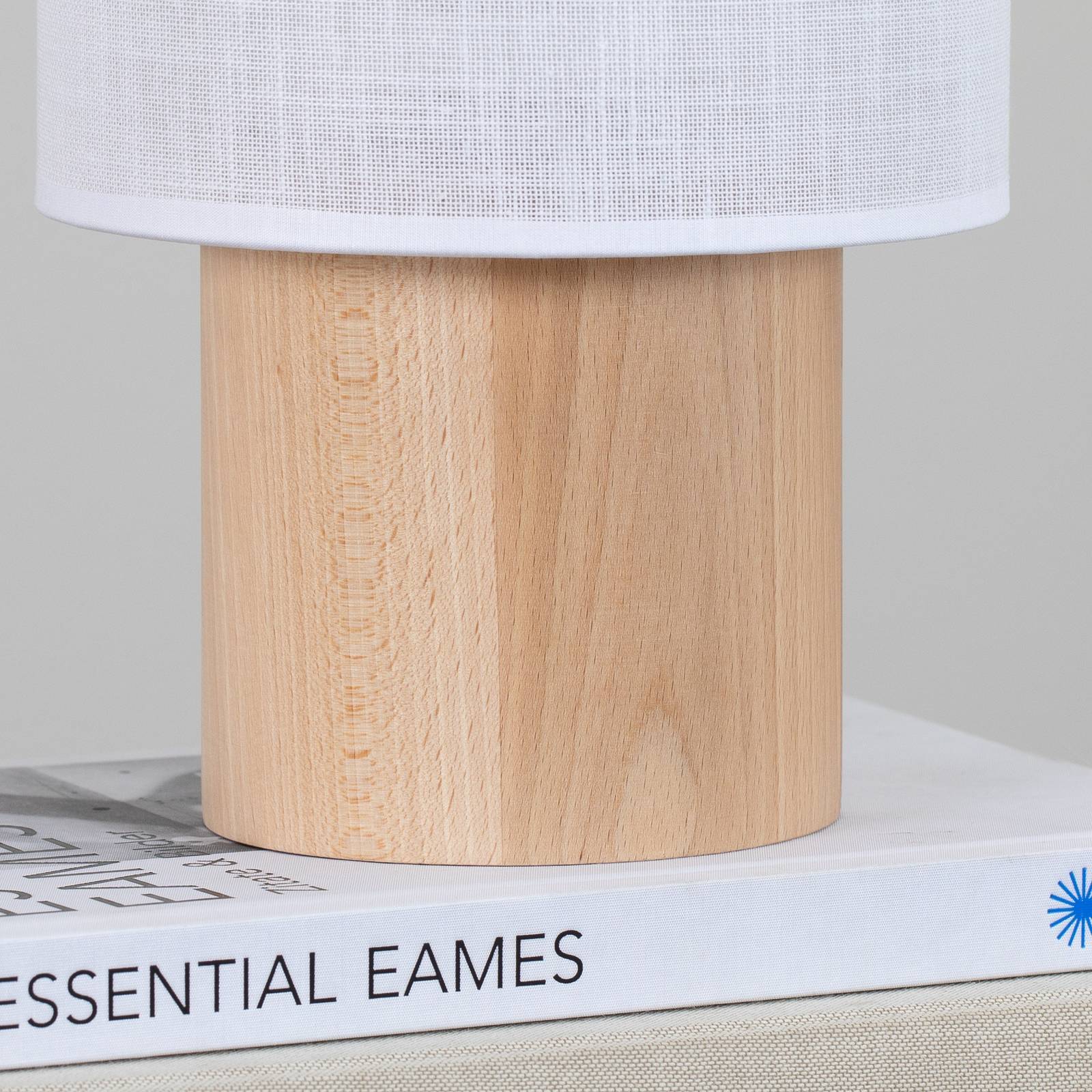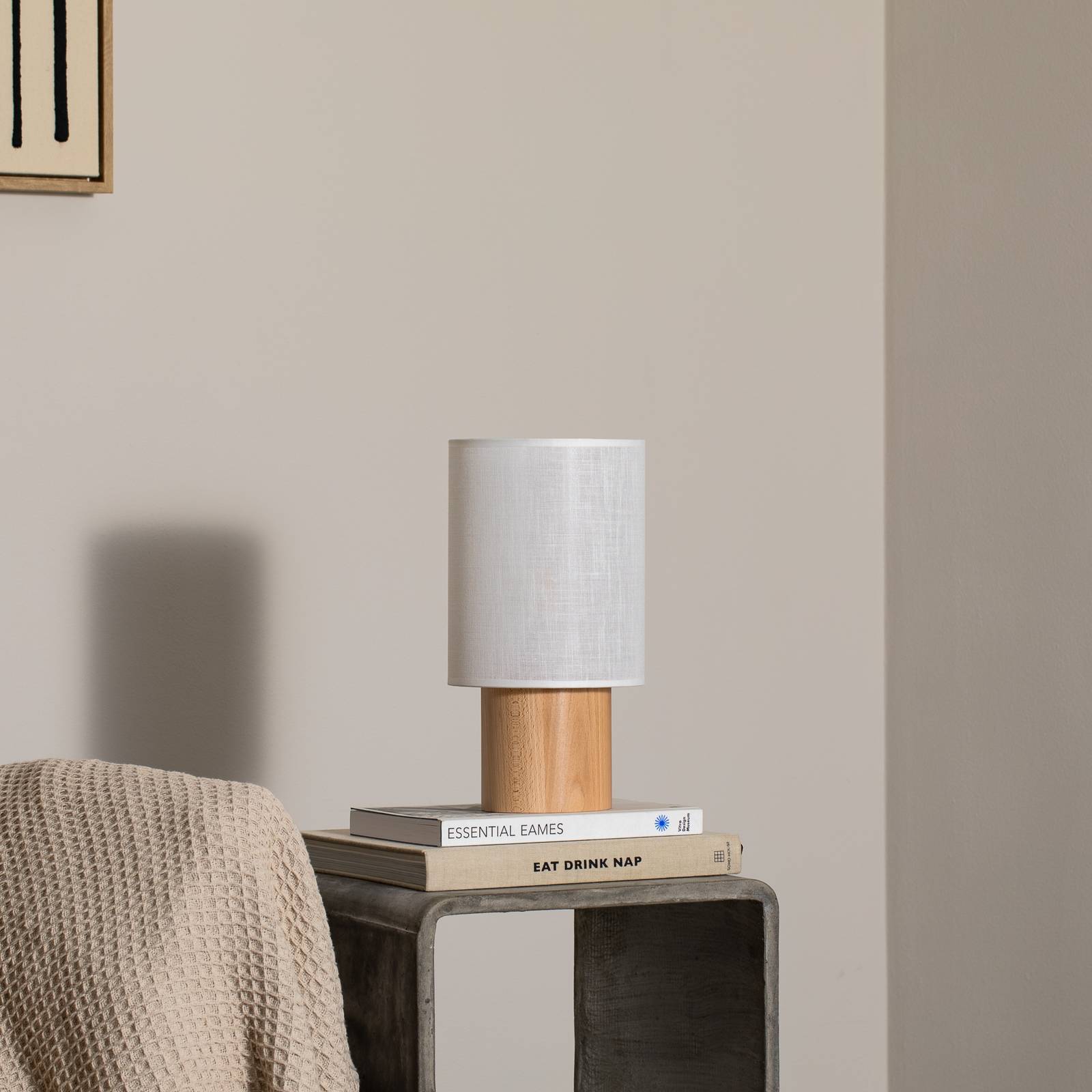 Cilindervormige tafellamp Asolita met houten voet en witte stoffen kap Als gezellige extra lichtbron verrijkt de tafellamp Asolita slaapkamers, woonkamers of eetkamers met haar Natur. De tafellamp is geproduceerd in Europa en heeft een cilindervormige stoffen kap in wit die de fitting omringt. Er is ook een iets kleinere voet gemaakt van lichtgekleurd eikenhout.