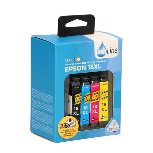 Inkline voordeelpak. Vervanging voor Epson 18XL (T1811,2,3,4) (4-pack). Bevat 1 x Zwart + 3 x Kleur. 1 x 14.6ml + 3 x 10ml.