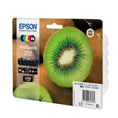 Dit multipack Epson 202 met inktcartridges is geschikt voor mensen die veel in kleur printen. De cartridges met Epson Claria Premium Ink laten zowel teksten als foto's er perfect uitzien.Deze set bevat de volgende cartridges- 1 x inktcartridge (zwart) - 6.9 ml - maximaal 250 pagina's- 1 x inktcartridge (cyaan) - 4.1 ml - maximaal 300 pagina's- 1 x inktcartridge (magenta) - 4.1 ml - maximaal 300 pagina's- 1 x inktcartridge (geel) - 4.1 ml - maximaal 300 pagina's- 1 x inktcartridge (fotozwart) - 4.1 ml - maximaal 400 pagina'sGeschikt voor: Epson Expression Premium XP-6000, XP-6005