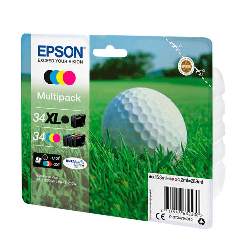 Epson´s DURABrite Ultra Ink multipack inktcartridges serie golfbal produceert professioneel uitziende documenten die tegen water, vuil en markeerstiften bestand zijn. Doordat ze snel drogen zijn ze zeer geschikt voor dubbelzijdig afdrukken. De zwarte cartridge heeft een inhoud van 16,3ml goed ca 1100 pagina's, de cartridges met cyaan, geel en magenta hebben een inhoud van 4,2 ml goed voor 300 pagina'sGeschikt voor Epson printers:WorkForce WF-3720DWFWorkForce WF-3725DWF