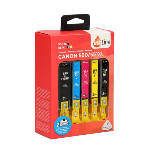 Inkline voordeelpak voor Canon 550/551 serie. Vervanging voor Canon PGI-550XL/CLI-551XL (5-pack). Bevat 2 x Zwart + 3 x Kleur. 1 x 22ml + 4 x 10.2ml.