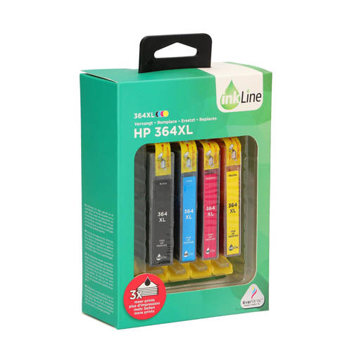 Inkline voordeelpak INH364BKCMY voor HP 364 serie. Geschikt voor alle HP printers met 364 inktpatronen. Vervanging voor HP 364XL (4-pack) . Bevat 1 x Zwart + 3 x Kleur. 1 x 30ml + 3 x 13ml.