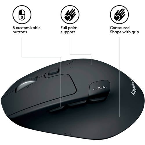 Met de M720 Triathlon kun je stil en efficiënt werken. Met de easy-switch technologie is het mogelijk om tussen drie computers te schakelen door middel van de schakelaar onder de duim. De verlichte nummers geeft aan met welk apparaat je verbonden bent.24 maanden batterijlevensduurMet één AA-batterij is het mogelijk om deze muis 24 maanden lang te gebruiken. Met de aan-uitschakelaar gaat hij nog langer meer en mocht de batterij bijna op zijn, waarschuwt de muis je.