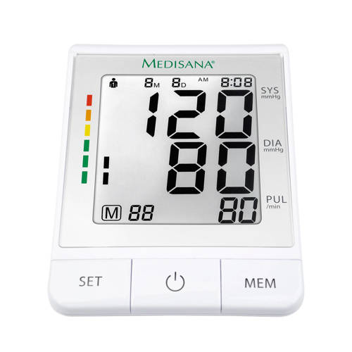 Met de Medisana BU 512 bovenarmbloeddrukmeter kun je welvaartsziekten voorkomen door je bloeddruk regelmatig te controleren. Een normale bloeddruk verlengt immers je leven. Met deze volautomatische bovenarm bloeddrukmeter van Medisana meet je zeer betrouwbaar en nauwkeurig je bloeddruk. Je bevestigt de manchet om je bovenarm en start de meting eenvoudig met slechts één druk op de knop. Op overzichtelijke wijze zie je vervolgens je bovendruk, onderdruk en hartslag, allen weergegeven in extra grote cijfers. Je kunt gemakkelijk zien of je zich in de gevarenzone bevindt dankzij de kleurenschaal indicatie volgens de richtlijnen van de World Health Organisation (WHO): met behulp van de kleurenschaal is te zien waar je bloeddruk zich bevindt, van groen (normaal) tot rood (te hoog). Ook herkent de BU 512 bloeddrukmeter een onregelmatige hartslag (aritmie) geeft deze weer op het display. Resultaten worden met vermelding van datum en tijd opgeslagen in het geheugen van de bloeddrukmeter. Tevens weergave ( 22 mm hoge cijfers) van het gemiddelde van alle opgeslagen gegevens. Je kunt voor twee gebruikers tot 90 metingen per persoon opslaan. Zo kun je gemakkelijk het verloop van je bloeddruk bijhouden.SpecificatiesAfmeting: ca. 13 x 11 x 6 cmGrote manchet 22-36 cm armomtrekGewicht: ca. 0,26 kgSystolische (boven) druk: JaDiastolische (onder) druk: JaGeheugenregister: 180Meetbereik: bloeddruk 0-299 mmHg, hartslag 40-199 slagen/minBatterijen: 4 x 1,5 V (AA)