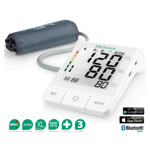Medisana bovenarmbloeddrukmeter BU 530 meet eenvoudig en snel de bloeddruk via de bovenarm. De metingen zijn eenvoudig bij te houden via de speciale Vitadock+ app op de smartphone. De hartslag, bovendruk en onderdruk worden nauwkeurig gemeten en hartritmestoornissen worden herkend. 2 Personen kunnen tot 120 metingen per persoon opslaan. Via de app wordt dan de voortgang bijgehouden en wordt verteld wat de invloed van een bepaalde levensstijl heeft op de bloeddruk.