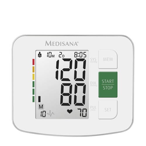 Met de Medisana BW 315 polsbloeddrukmeter kun je op een eenvoudige manier jouw bloeddruk meten. Je bevestigt de manchet om je pols en start de meting eenvoudig met slechts één druk op de knop. Op overzichtelijke wijze zie je vervolgens de waarden op het heldere, grote display verschijnen, samen met de datum en tijd van de meting. Je kunt gemakkelijk zien of je zich in de gevarenzone bevindt dankzij de kleurenschaal indicatie volgens de richtlijnen van de World Health Organisation (WHO): met behulp van de kleurenschaal is te zien waar je bloeddruk zich bevindt, van groen (normaal) tot rood (te hoog). Ook herkent de BW 315 bloeddrukmeter een onregelmatige hartslag (aritmie) geeft deze weer op het display. De bloedrukmeter werkt op 2 x 1,5 V (AA) meegeleverde batterijen.- Grote manchet (12,5-21,5 cm polsomtrek)- Bijzonder groot, gemakkelijk leesbaar display- Weergave batterijstatus- Aritmie-indicatie- Berekening van de gemiddelde waarden uit drie opeenvolgende metingen (3/MAM technologie)- Klassering van de meetwaarden met kleurenschaal volgens de normen van de WHO (World Health Organization)