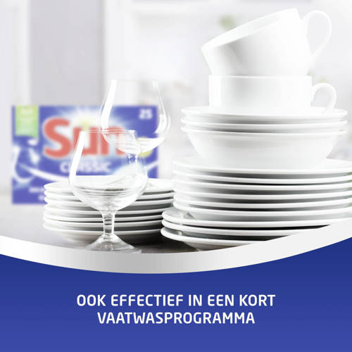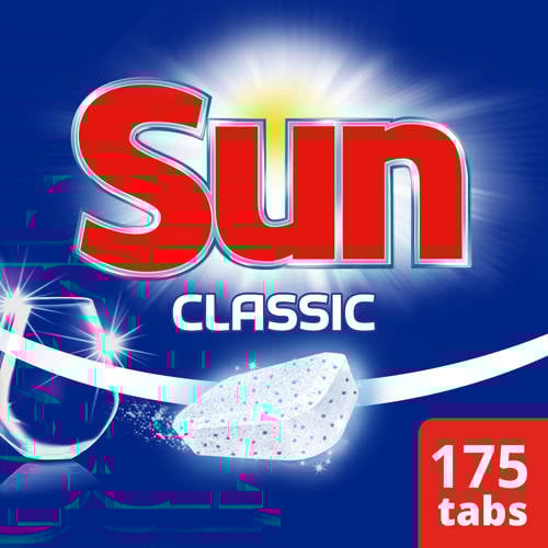 Verwijdert hardnekkige vlekken en zorgt voor een uitstekend schone vaatSun Classic vaatwastabletten zorgen voor een smetteloos resultaat in een handomdraai. De vaatwastabletten zijn nu nog geconcentreerder en verwijderen zelfs de meest hardnekkige vlekken waarvan je dacht dat ze voor altijd zichtbaar zouden blijven. Je zult na elke wasbeurt versteld staan van je stralende vaat. Ook nemen de vaatwastabletten onaangename geurtjes weg. Kenmerken: - Extra geconcentreerd - Gegarandeerd stralende vaat- Als beste getest op gebied van reiniging- Voorspoelen is niet nodigDeze voordeelverpakking bevat 7 pakken met 39 tabs, samen goed voor 273 vaatwasbeurten.Sun Classic vaatwastabletten zitten tegenwoordig in een aluminium tabletfolie die voor het vaatwassen verwijderd moet worden. Dit hebben we gedaan om zo de plastic binnenverpakking, die de tabletten voorheen beschermde tegen vocht en beschadiging, uit de verpakking te kunnen halen om zo meer rekening te houden met de impact van onze producten op het milieu. Verder bevatten Sun Classic vaatwastabletten geen fosfaat. Als je Sun Classic vaatwastabletten gebruikt in combinatie met spoelglansmiddel en zout weet je zeker dat je je afwasmachine optimaal beschermt tegen kalkaanslag. Zo kun je verzekerd zijn van een geweldig schone en glanzende vaat, elke keer weer. De intens reinigende kracht van Sun Classic vaatwastabletten geeft een geheel nieuwe betekenis aan de term hygiënisch schoon.Wist je dat afwassen met de machine minder water verbruikt dan afwassen met de hand? Moderne vaatwassers verbruiken slechts 10 à 15l water per afwas. Bij afspoelen en afwassen met de hand wordt al gauw meer water gebruikt. Vergeet niet dat uit een stromende kraan al snel 10l water per minuut komt. Nog enkele tips om uw energie- en watergebruik te beperken: 1) Laat de vaatwasser enkel draaien wanneer hij vol is, 2) Kies voor een A-merk vaatwasser, 3) Kies voor Sun producten. Deze zijn fosfaatvrij en dus wordt er rekening gehouden met het milieu. Bovendien zijn de verpakkingen van de tabletten 100% recyclebaar, 4) Voorspoelen is niet nodig, 5) Gebruik de programma’s op lage temperaturen, 55°C volstaat. Sun wordt aanbevolen door grote merken, zoals Tefal, Curver en Bormioli Rocco.