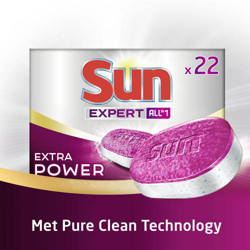 Nu met Pure Clean Technology voor een uitstekend resultaatMet de Pro Clean Technologie ben je verzekerd van een effectieve vuilverwijdering, uitstekende vlekverwijdering en actieve ontvetting. Daarnaast reinigt Sun Expert All-in-1 Extra Power niet alleen je vaat, maar zorgt het ook voor je machine; het voorkomt kalkaanslag in je vaatwasser. Door de ingebouwde spoelglans en zoutfunctie, zorgen deze vaatwastabletten niet alleen voor het reinigen van je vaat maar ook voor extra glans en voorkomen ze kalkaanslag. Zout en spoelglans hoeven dus niet afzonderlijk toegevoegd te worden, voor nog meer gebruiksgemak. De vaatwastabletten zijn verpakt in hydrofilm folie. Dit is 100% oplosbaar in water, je kunt de folie dus gewoon om het tablet laten zitten. Sun all-in 1 bevat geen fosfaat. Pure Clean Technologie: - Effectieve vuilverwijdering- Uitstekende vlekverwijdering- Actieve ontvetting- Met oplosbare hydrofilm, het verwijderen van folie is niet nodigDeze voordeelverpakking bevat 6 pakken met 24 tabs, samen goed voor 144 vaatwasbeurten.Bij het gebruik van normale tabletten moet je ook nog zout en spoelglans toevoegen. Deze heb je nu niet meer nodig, want deze zijn ingebouwd in Sun All-in-1 vaatwastabletten. Het toegevoegde zout zorgt ervoor dat het water gedurende het proces wordt verzacht en er geen kalkaanslag op het glaswerk ontstaat en de spoelglans voor een streeploos resultaat. Een vaatwastablet is voldoende om je vaat heerlijk fris te laten ruiken.Wist je dat afwassen met de machine minder water verbruikt dan afwassen met de hand? Moderne vaatwassers verbruiken slechts 10 à 15l water per afwas. Bij afspoelen en afwassen met de hand wordt al gauw meer water gebruikt. Vergeet niet dat uit een stromende kraan al snel 10l water per minuut komt. Nog enkele tips om uw energie- en watergebruik te beperken: 1) Laat de vaatwasser enkel draaien wanneer hij vol is, 2) Kies voor een A-merk vaatwasser, 3) Kies voor Sun producten. Deze zijn fosfaatvrij en dus wordt er rekening gehouden met het milieu. Bovendien zijn de verpakkingen van de tabletten 100% recyclebaar, 4) Voorspoelen is niet nodig, 5) Gebruik de programma’s op lage temperaturen, 55°C volstaat. Sun wordt aanbevolen door grote merken, zoals Tefal, Curver en Bormioli Rocco.