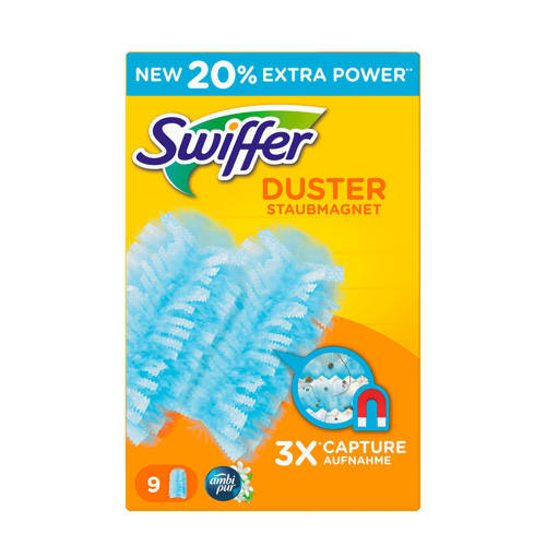 Vangt en houdt tot 3 keer meer stof en haar vast dan een gewone plumeauNeem maar afscheid van stof, vuil en haar en maak kennis met netheid en een heerlijke geur van Ambi Pur. De Swiffer Dusters zijn het middel om stof, haar en allergenen van huisstofmijten, katten en honden op oppervlakken te vangen en vast te houden dankzij de duizenden licht gecoate pluizige vezels. De Swiffer Duster stofdoekjes beschikken over unieke vezels die van vorm veranderen. Hierdoor kun je bij de moeilijkst bereikbare plekjes komen om van bijna elk oppervlak stof en haar te verwijderen zonder het in huis te verspreiden. Laten een frisse geur van Ambi Pur achter. Handige tips: Ze zijn vooral handig om het haar van je huisdieren, dat constant uitvalt, te verwijderen of als je last hebt van een stofallergie. Voor je het weet, ga je afstoffen nog leuk vinden: zo goed werkt het. Gebruik de Swiffer duster navullingen met het Swiffer Duster handvat.Voordelen en kenmerken•9 Geparfumeerde navullingen (duster handvat apart verkocht)•Met de frisheid van Ambi Pur•Schud de navulling even op voordat je hem gebruikt voor optimale Trap & Lock-werking•Het ergonomische handvat ligt perfect en comfortabel in de hand•Heeft duizenden flexibele pluizige vezels die het stof en haar opvangen dat plumeaus zouden verspreiden•Werkt op bijna elke droge ondergrond zonder pluis achter te laten•Geweldig om haar van huisdieren te verwijderen