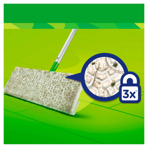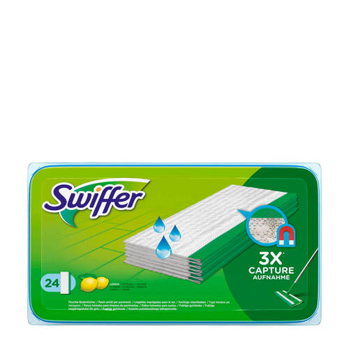 Snel en makkelijk schoonmakenWie zegt dat Swiffer alleen voor droog schoonmaken is? Swiffer heeft ook vochtige doekjes met een krachtig vuiloplossend schoonmaakmiddel dat het vuil van oppervlakken verwijdert en vasthoudt. Houd je vloeren schoon en laat ze heerlijk ruiken met een unieke schoonmaakvloeistof die hardnekkige vlekken, vuil en verontreiniging oplost en diep in het doekje opslorpt, zodat het schoonmaken van tegelvloeren of linoleum vanzelf gaat. En om hardnekkige vlekken te verwijderen, kan je de kop omkeren en de vlekken schrobben met de groene schrobstrook. Doordat hij zo vlak is kan je plekken schoonmaken die je niet kan bereiken met andere vloerreinigingssystemen (onder banken, bedden, koelkasten en vaatwassers…). Ja, je Swiffer Vloerreiniger werd opeens een 2-in-2 tool: gebruik met de droge doekjes om het stof te vangen en met de vochtige dweildoekjes om schoon te maken. Ze zijn zelfs geschikt voor gebruik op houten vloeren. Gebruik de Swiffer Vloerreiniger vochtige doekjes niet op onbehandeld, geolied of geboend parket, op onbehandelde natuursteen of tapijten.Voordelen en kenmerken•24 Navullingen (vloerreiniger apart verkocht)•Vooraf bevochtigde doekjes gedrenkt in schoonmaakmiddel vangen vuil en houden het diep in het doekje vast•Krachtige, unieke vuiloplossende schoonmaakmiddelen verwijderen vuil van oppervlakken en houden het vervolgens vast•Keer de kop van de Swiffer om hardnekkige vlekken weg te schrobben met de schrobstrook•Frisse citroengeur•Ideaal voor vinyl, keramische tegels of behandelde houten vloeren•Gebruik niet op onbehandeld, geolied of geboend parket, of op onbehandelde natuursteen en tapijten