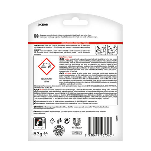 Het Glorix WC blok Blauw Water Ocean geeft elke spoelbeurt de kracht van nieuwe Glorix Power 5+- Met reinigend schuim- Zorgt elke spoelbeurt voor een intense hygiënische reiniging- Anti-Kalk werking- Langdurige frisheid in het toilet- Glanzend eindresultaat met langer blauw water- Geef elke spoelbeurt de kracht van nieuwe Glorix Power 5+ Blauw WaterHet Glorix WC blok Blauw Water Ocean geeft elke spoelbeurt de kracht van nieuwe Glorix Power 5+: 1. Reinigend schuim. 2. Anti-Kalk. 3. Lang fris. 4. Langer Blauw Water. 5. Intense hygiënische reiniging. Gebruiksaanwijzing: - Vouw de hanger open. - Hang het toiletblok over de rand van het toilet, zodat het blok in contact komt met water bij het doorspoelen. - Als het toiletblok op is de hanger weggooien in de vuilnisbak. - Was de handen na het aanraken. Met Glorix je hele toilet écht schoon! Met het stappenplan van Glorix houd je je toilet gemakkelijk hygiënisch schoon, zowel in- als rondom het toilet en zowel onder- als boven water. Stap 1: Gebruik dagelijks Glorix Bleek in het toilet voor hygiënische reiniging. Stap 2: Gebruik daarnaast één keer per week Glorix 100% Anti-Kalk voor een stralend wit toilet zonder kalkaanslag. Stap 3: Gebruik een Glorix Power 5 Toiletblok voor een hygiënisch schoon toilet tussen de spoelbeurten door. Stap 4: Houd het toilet tussen de schoonmaakbeurten door hygiënisch schoon met de Glorix Toiletdoekjes. Stap 5: Maak de gehele toiletruimte snel, gemakkelijk en hygiënisch schoon met de Glorix Bleek Spray. Zo bent u er zeker van dat uw toilet altijd glanzend schoon is en heerlijk fris ruikt. Kijk voor de beste schoonmaaktips ook op de website www.cleanipedia.nl. Deze staat vol handige tips en instructies zodat u alles makkelijk mooi en snel kan schoonmaken.