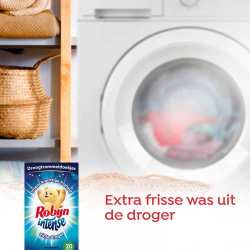 Met Robijn Morgenfris Droogtrommeldoekjes wordt het wasgoed in de droger extra verzorgd en krijgt het een heerlijk frisse geur.- Extra frisse was uit de droger- Robijn Morgenfris Droogtrommeldoekjes maken je was nog zachter- Robijn Droogtrommeldoekjes hebben een heerlijk parfum- Robijn Droogtrommeldoekjes zijn verpakt in een makkelijke verpakking- 1 pak Robijn Droogtrommeldoekjes gaat 20 drogerbeurten mee- Gebruik in combinatie met Robijn wasmiddel en wasverzachter MorgenfrisRobijntje is al jarenlang niet meer weg te denken bij de Nederlandse wasmachines. Wie kent het schattige beertje uit de Robijn reclames niet? Intense Robijn Morgenfris Droogtrommeldoekjes zorgen voor een frisse en zachte was uit de droger. Deze doekjes zijn speciaal ontwikkeld om het wasgoed in de droger te verzorgen en extra geur toe te voegen en de kleding een intense krachtige frisheid mee te geven. De ideale Robijn kledingverfrisser. Een Robijn Morgenfris Droogtrommeldoekjes voorkomt bovendien dat je kleding statisch wordt. Als je Robijn droogtrommeldoekjes gebruikt in combinatie met Morgenfris wasmiddel en wasverzachter van Robijn, kun je optimaal genieten van de Morgenfris geur en is je kleding nog beter beschermd tegen slijtage. Elke verpakking bevat 20 doekjes en is dus goed voor 20 droogbeurten. Zo ben je keer op keer verzekerd van zacht wasgoed dat nog steeds heerlijk ruikt. Let op: uitsluitend geschikt voor gebruik in de droogtrommel; gebruik niet in de wasmachine. Robijn wasmiddel en wasverzachter zorgen er samen voor dat je was lang mooi blijft dankzij de speciale formules die de vezels en kleuren van je kleding beschermen, zodat je nog langer van je favoriete kleding kunt genieten. Want wat mooi is, moet mooi blijven. Gebruik in combinatie met Robijn Morgenfris wasmiddel en wasverzachter voor het lekkerste resultaat.