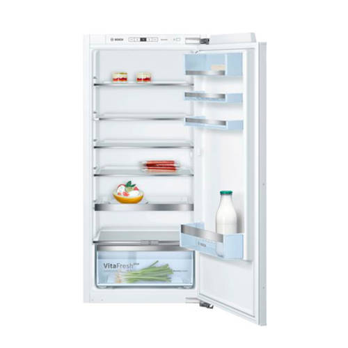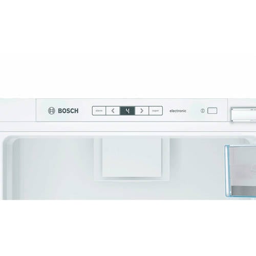 Deze Bosch KIS87AF30 inbouw koelvriescombinatie met een energieklasse A++ en een verbruik van 225 kWh is geschikt voor een nismaat tot 177,5 cm. Het koelgedeelte heeft een inhoud van 209 liter en het viersterren vriesgedeelte van 61 liter. Bediening via digitaal display. De elektronische temperatuurregeling: regelt de gewenste temperatuur eenvoudig Het koelgedeelte is voorzien van - 5 veiligheidsglas plateaus (4 in hoogte verstelbaar), waarvan VarioShelf: variabel legplateau uit veiligheidsglas, 2 uitschuifbare legplateaus uit veiligheidsglas. Verder met een VitaFresh Plus-lade met luchtvochtigheidsregeling: groente en fruit blijven tot wel 2 keer langer vers en vitaminerijk. In het diepvries gedeelte zijn 2 transparante diepvriesladen aangebracht waarvan 1 Bigbox. De invriescapaciteit is 7 kg/uur en de bewaartijd bij stroomuitval is 26 uur. Deze koelkast is ook voorzien met superkoelen en supervriezen dwz nieuwe levensmiddelen worden sneller gekoeld en/of ingevroren hiermee wordt voorkomen dat de temperatuur van de al aanwezige levensmiddelen omhoog gaat. Het interieur is voorzien van een heldere LED binnen verlichting en Low Frost. Hierdoor wordt aanzienlijk minder ijs gevormd en hoef je minder vaak te ontdooien. De verminderde ijsvorming zorgt ook voor een lager energieverbruik.. De KIS87AF30 beschikt over een vlakscharniersysteem (deur op deur), de draairichting is eventueel aan te passen. Vlakschanier De deur van de keuken en die van de koelkast zitten aan elkaar vast zonder tussenruimte. Je bevestigt dus de deur van de keuken op de deur van de koelkast. Wijziging draairichting deur De draairichting van de deur(en) is te wijzigen naar eigen inzicht. Het is door de aanwezige elektronica niet eenvoudig dit zelf te doen. Je kunt de servicedienst van Bosch in je regio benaderen dit voor een vergoeding voor je te regelen. Mocht je toch besluiten om dit klusje zelf te klaren, valt de eventuele schade die wordt veroorzaakt bij pogingen om de deuropening om te draaien niet onder de garantie van Bosch. Wehkamp kan deze service helaas niet aanbieden. Afmetingen en gewicht:- Inbouwafmeting (hxbxd): 177,2-178-x56x55-56 cm- Afmeting (hxbxd): 177,x55,8x54,5 cm - Gewicht 67,7 kg