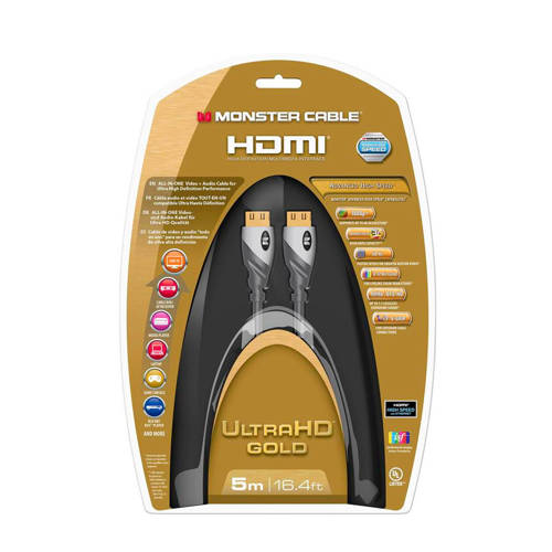Monster UHD 4K Gold HDMI kabel met gepatenteerde aansluitingen die zorgen voor een grotere betrouwbaarheid van de verbinding (vier keer betrouwbaarder dan gewone HDMI connectoren) welke zijn opgedampt met een laagje goud (24k) om oxidatie en corrosie dat de bandbreedte vermindert te voorkomt. De High-density drievoudige afscherming beschermt het HDMI-signaal tegen elektromagnetische en radio-interferentie en voorkomt daarmee signaalverlies dat de beeldkwaliteit en geluid doet verminderen.De kabel heeft een lengte van 5 meter.Specificaties:- Type: CORDNHDGOL- Aansluiting 1: mannelijk- Aansluiting 2: mannelijk- Datasnelheden tot 18 Gbps- HDMI versie: 2.0- Licening Group met beeldverversingssnelheden tot 50fps- Geschikt voor: HDTV 1080p 3D , HD- videobron of 3D Blu-ray speler, media centers en gaming in 4K (tot 8 bits kleurdiepte).- Ondersteund: HEC (HDMI Ethernet Channel), ARC (Audio Return Channel) en CEC (Consumer Electronics Control)