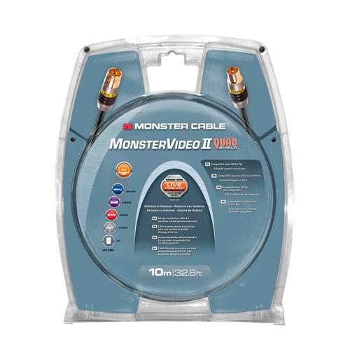 Monster Video II QuadShield antennekabel met een lengte van 10 meter. Door de viervoudige afscherming krijgen stoorsignalen geen kans en dankzij de Turbine connectors maakt de kabel een uitstekende verbinding met zowel de CAI doos als de televisie zelf.Specificaties:- Type: MCQUADPCX- Aansluiting 1: Coaxplug male- Aansluiting 2: Coaxplug female- Viervoudige afscherming (2x folie, 2x koperdraadnetwerk van hoge dichtheid) voor storingsvrij signaal, ook op de lange lengten- 24k vergulde Turbine connector voor optimale corrosievrije signaaldoorgifte- Precisie 75 ohm constructie voor hoogste signaal integriteit- Geschikt voor analoge en digitale televisie- Geschikt voor analoge radio- Meervoudige koperkern voor betere soepelheid en korte buigradius