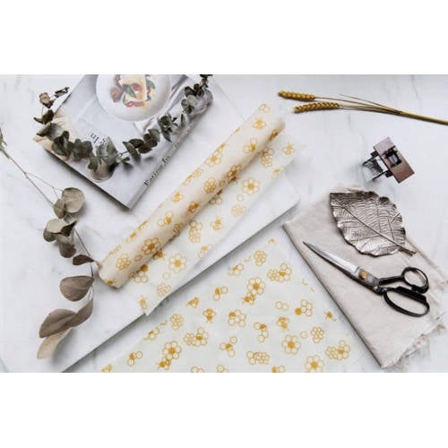 Met de milieuvriendelijke bijenwasdoeken van Bee's Wax verpak en bewaar je jouw etenswaren op een duurzame manier! Dewraps zijn gemaakt van100% organische materialen waaronder bijenwas en katoen. De doeken zijn een duurzame vervanging voor plastic huishoudfolie of aluminiumfolie.Ook zijn de doeken tot een jaar herbruikbaar en zijn ze antibacterieel. De doeken kunnen zowel in de koelkast als in de vriezer bewaard worden.In deze set zitten drie verschillende formaten met een leuke honingraatprint.Het formaat18 x 20 cm is geschikt voor het verpakken van kleine etenswaren zoals halve avocado's en kleine stukken kaas en het afdekken van kleine kommen.Het formaat 25 x 28 cm geschikt voor het afsluiten van een stuk komkommer of het inpakken van een medium stukkaas. Ook kun je er medium grote kommen mee afdekken.Het formaat 33 x 35.5 cm is ideaal voor het verpakken van sandwiches, halve stokbroden en een groot stuk kaas. Daarnaast is het grote formaat ideaal voor het afdekken van grote kommen of borden!Gebruik en reinigingsinstructieHet gebruik is simpel: de wrap wordt soepel door de warmte van je handen en kan zo makkelijk om schaaltjes, groente, fruit en brood gevouwen worden. Houd verder de wrap weg bij warmte bronnen om het smelten van de wax te voorkomen. Dit is geldt ook voor warme etenswaren.Het reinigen van de doek doe je met koud water en een alcohol vrije zeep. Door alcohol lost de natuurlijke coating namelijk op waardoor de wrap niet meer efficiënt is. Laat verder de bijenwasdoek aan de lucht drogen alvorens deze op te bergen. Als je deze instructies volgt kun je tot een jaar lang gebruik maken van jouw bijenwasdoek!