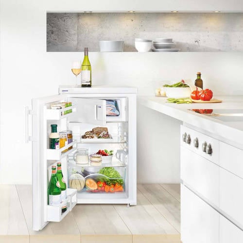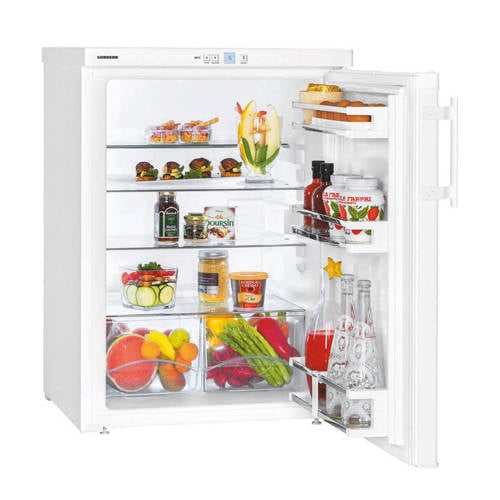 Liebherr T1760-22 tafelmodel koelkast met energieklasse A+++ en een koelruimte van maar liefst 156 liter. Deze zuinige koelkast gebruikt slechts 64 kWh per jaar! Dat scheelt in je portemonnee en is goed voor het milieu! De T1760-22 heeft onder andere 2 groente-/fruitladen, 4 glazen legplateaus met RVS afwerking en enkele deurvakken. Tevens beschikt de koelkast over een automatisch ontdooisysteem, een LCD temperatuurdisplay,kinderbeveiliging en een SuperCool automaat. Door het afneembare bovenblad is hij voor onderbouw geschikt, en de deurdraairichting is verwisselbaar.SuperCool automaat:SuperCool verlaagt de temperatuur tijdelijk naar +2°C waarmee wordt voorkomen dat de temperatuur in de koelruimte boven toelaatbare waarden stijgt doordat pas ingekochte, warmere, producten in de koelkast worden gelegd. Voordatje boodschappen gaat doen, druk jede SuperCool toets in. De temperatuur wordt daarna gedurende 6 uur verlaagd naar +2°C. Hiermee wordt ervoor gezorgd dat wanneer je, je boodschappen in de koelkast legt, deze snel worden gekoeld en de temperatuur van deal in de koelkast aanwezige producten niet boven +7°C zal stijgen.Wijziging draairichting deurDe draairichting van de deur(en) is te wijzigen naar eigen inzicht. Het is mogelijk dit zelf te doen of onze bezorger zet hem tegen een geringe vergoeding voor je om. Je kunt dit aangeven onder het kopje service.