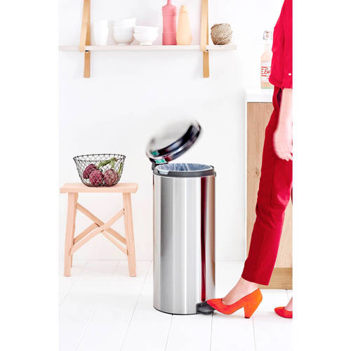 Deze hoge Brabantia newIcon pedaalemmer, in de kleur Matt Steel Fingerprint Proof, met een kunststof binnen emmer heeft een inhoud van 30 liter. Dankzij de anti-slip onderkant en anti-kantel blok is deze pedaalemmer stevig en staat altijd op zijn post. Deze newIcon pedaalemmer is geurdicht, makkelijk te openen, makkelijk te verplaatsen en makkelijk schoon te maken. Dankzij de unieke soft-closure techniek sluit het deksel soepel en stil en kun je eenvoudig afval weggooien zonder te morsen dankzij de grote inwerpopening. De pedaalemmer wordt geleverd met een proefverpakking van Brabantia PerfectFit afvalzakken (code G), deze zijn gemakkelijk en praktisch onzichtbaar aan te brengen.Bovendien help je met de aanschaf van deze pedaalemmer onze wereld wat schoner te maken want Brabantia gaat plastic uit de wereldse wateren 'vissen'.Voor elke verkochte newIcon pedaalemmer, doneert Brabantia namelijk aan The Ocean Cleanup, de grootste schoonmaak uit de geschiedenis. The Ocean Cleanup ontwikkelt vooruitstrevende technieken om de oceanen te zuiveren. De uitvinding van de destijds 17-jarige Boyan Slat verzamelt het afval door middel van een passief systeem van enorm lange, drijvende barrières en die de stroming het werk laat doen. Volgens modelberekeningen kan dit systeem in tien jaar tijd de helft van de Great Pacific Garbage Patch, de plastic soep in de Stille Oceaan, opruimen. Momenteel wordt een prototype van dit systeem getest in de Noordzee'.Specificaties- Inhoud: 30 liter- Deksel sluit geruisloos - Superlicht te bedienen pedaal- Reukdichte deksel- Gemakkelijk te reinigen - Uitneembare binnen emmer- Anti-slip bodem - Handgreep in dekselscharnier- Materiaal body: rvs- Kleur: Matt Steel Fingerprint Proof- 10 jaar garantie en serviceAfmetingen en gewicht- Afmetingen (hxbxd) 67.5x30x34 cm- Gewicht: 3.66 kg