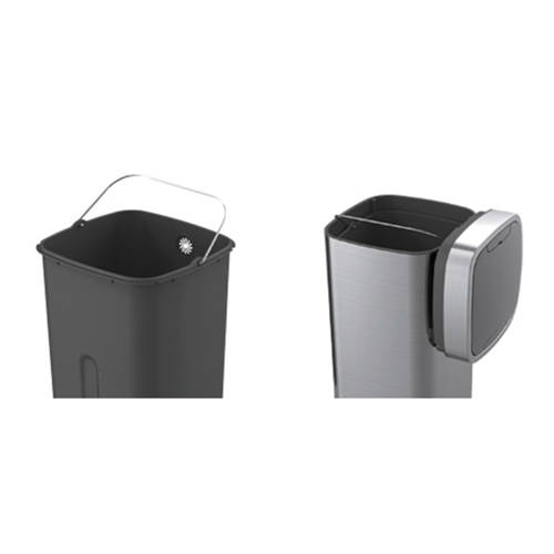 Deze SimpleHuman Rectangular Touch Bar SH0015835 afvalbak in RVS is voorzien van twee aparte uitneembare kunststof binnen emmers met elk een inhoud van 24 liter zodat jij makkelijk jouw afval kunt scheiden. Deze afvalbak heeft een grote Touch-Bar waarmee de deksel geopend kan worden: een tikje met je hand, elleboog of heup is voldoen om de deksel te laten openen. Doordat de buitenkant fingerprint-proof is zul je geen last hebben van vette vingers die op de prullenbak te zien zijn. De afvalbakken van Simplehuman hebben een speciale binnenbak, waardoor de vuilniszak niet over de buitenkant heen valt. Met 10 jaar garantie.Specificaties:- Geschikte afvalzakken: code G- Materiaal: RVS- Inhoud: 2 x 24 liter- Afmetingen (hxbxd): 71x50x29 cm- Gewicht: 8,1 kg• Inhoud per onderdeel: 48 (2x24)
