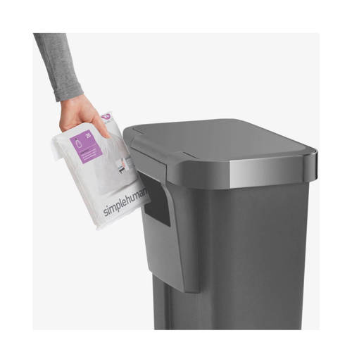 De Simplehuman Rectangular kunststof Liner Pocket heeft een inhoud van 45 liter. Het deksel opent in 2 delen. Het bovenste deksel reageert op het pedaal. De gehele deksel valt netjes over de vuilniszak heen zodat deze niet zichtbaar is aan de buitenkant. Uiteraard beschikken de afvalemmers van Simplehuman over een silent closed deksel. Minder kans om met kinderhanden tussen afvalemmer en deksel te komen en de emmer sluit hierdoor geruisloos. De afvalemmer is van duurzaam kunststof en heeft RVS accenten. Voor deze afvalemmer is vuilniszak code K van gewenst.