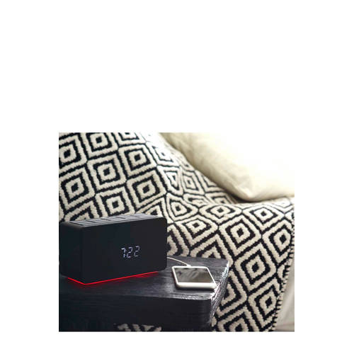 Met deze stijlvolle Thomson CL300P wekkerradio heb je de keuze om op verschillende manieren gewekt te worden. De wekkerradio beschikt niet alleen over verschillende handige functionaliteiten zoals twee wektijden, FM radio en tijdprojectie, maar ziet er met z’n strakke zwarte design mét ambilight led-verlichting in maar liefst zeven kleuren ook nog eens heel mooi uit. Je hoeft niet bang te zijn dat het licht van de display je uit je slaap houdt. Het scherm is dimbaar zodat je nooit last hebt van een té felle wekker met projectie in je slaapkamer.Je kunt de digitale FM tuner gebruiken om een geschikte radiozender te zoeken. Het display geeft precies aan op welke frequentie de radio afgesteld staat. En wil je nog héél even blijven liggen? Gebruik dan de snooze of alarmherhalingsfunctie. De wekker met projectie beschikt ook over een USB aansluiting. Hiermee kun je bijvoorbeeld ‘s nachts je mobiele telefoon opladen. Handig, want dat scheelt weer een stopcontact!