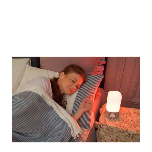 Sleepace NOX MUSIC, een slaaplamp die je in slaap helpt vallen met rustgevende geluiden en rood licht, die je tevens op natuurlijke wijze wakker maakt door de gesimuleerde zonsopgangfunctie. Deze slimme lamp meet tevens o.a. de omgevingstemperatuur, luchtvochtigheid, licht - en geluidniveaus in je slaapkamer. De NOX Music is heel eenvoudig te bedienen dankzij bluetooth speaker en gebarenbediening.