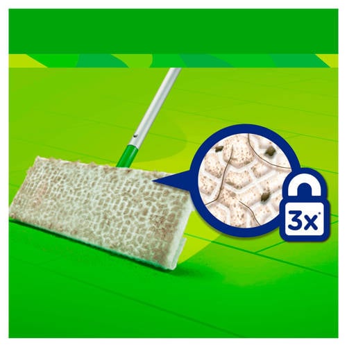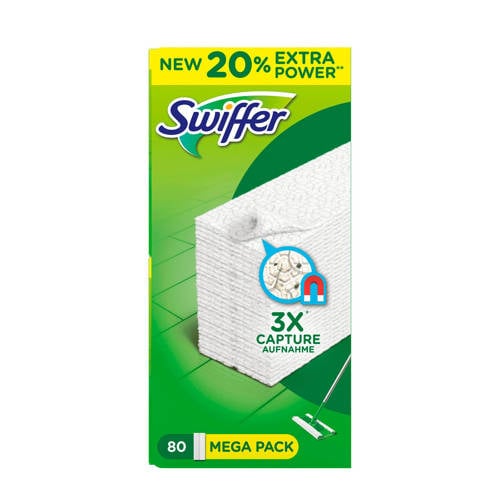 Vangt en houdt 3 keer meer stof, vuil en haar vast in vergelijking met een bezemSwiffer stofdoekjes dienen te worden gebruikt met de Vloerreiniger om vuil, stof en haar op elk vloeroppervlak in je huis te vangen en vast te houden. 3x beter dan een bezem. Hij kan ook worden gebruikt ter aanvulling van je stofzuiger, om het fijne overige stof op te vangen of als schoonmaakmiddel tussendoor, een truc om te voorkomen dat je te veel grondig schoonmaakt. Hoe? Waarom? Dankzij de dikte en het specifieke patroon van de stofdoekjes en hun antistatische werking vangt en houdt het doekje al het stof vast. Bovendien kan je met de 360° beweegbare kop van de Swiffer Vloerreiniger overal schoonmaken, zelfs op moeilijk bereikbare plekjes zoals onder de koelkast, het fornuis en de vaatwasser, onder bedden en banken en zelfs in hoeken en randen waar bezems en dweilen niet bij kunnen. Dat is toch geweldig? Met de Swiffer stofdoekjes gaat schoonmaken sneller en gemakkelijker dan ooit. Handige tips: Ze zijn vooral handig om het haar van je huisdieren, dat constant uitvalt, te verwijderen of als je last hebt van een stofallergie. De Swiffer doekjes kunnen worden gebruikt op elk hard oppervlak, zoals: al dan niet geboend linoleum, vinyl, keramische tegels en behandelde houten vloeren.Voordelen en kenmerken•80 Navullingen (vloerreiniger apart verkocht)•Werkt op bijna elke droge ondergrond zonder pluis achter te laten•De 360° beweegbare kop maakt het mogelijk om schoon te maken op moeilijk bereikbare plekjes•Geweldig om haar van huisdieren te verwijderen
