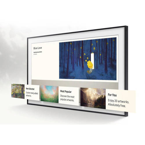 Samsung The Frame is speciaal ontworpen om te passen in jouw interieur. Met zijn lijst omranding lijkt het net een schilderij. Wanneer je geen tv kunt kun je zelfs een schilderij op het scherm laten zien en met de beeldkwaliteit van The Frame wordt dit kunstwerk het hoogtepunt van je kamer.Art ModeMet de speciale Art Mode kun je kiezen uit de vele kunstwerken uit de Samsung collectie, welke aanbevelingen doet naar jou smaak met de Auto Curation functie. Mocht je hier niet mee tevreden zijn dan kun je ook je eigen foto’s uploaden via een usb-stick of je smartphone. Mocht je dan nog niet tot je artistieke top zijn gekomen kun je zelfs filters toevoegen aan je zelf geüploade foto’s.Geweldig beeldUiteraard heeft Samsung er ook weer alles aan gedaan om The Frame geweldig beeld te geven. Niet alleen de kunst wordt perfect weergegeven, maar ook als je naar een film kijkt geniet je van haarscherp beeld met prachtige kleuren. Het QLED scherm met Quantum Dot-technologie zorgt voor 100% kleurvolume voor prachtig helder beeld. De Dual LED-technologie vergroot het contrast op basis van de achtergrondtemperatuur voor optimale kleurtonen. Het resultaat heeft superrealistische kleuren en rijke details.Past in elk interieur en elke ruimteVoor The Frame maakt het niet uit waar je hem plaatst, hij is altijd naadloos in jouw interieur te integreren. Om te beginnen is The Frame met de No Gap Wall-mount naadloos op te hangen aan de muur. Alle randapparatuur kan worden aangesloten op de One Connect Box zodat er slechts een dunne kabel naar de tv hoeft en jij niet alle kabels hoeft weg te werken. Daarnaast zijn er losse lijsten verkrijgbaar zodat je niet alleen het beeld, maar ook de lijst naar jouw eigen stijl kunt aanpassen.The Frame past zichzelf ook nog eens actief aan naar de ruimte waarin hij staat. De helderheidssensor detecteert het omgevingslicht en past de helderheid van het beeld aan voor een realistische en natuurlijke weergave. The Frame heeft ook een bewegingssensor waardoor de tv weet of er mensen in de kamer zijn. Is er niemand, dan gaat het beeld uit. En waar aan als er iemand en kamer in komt lopen.