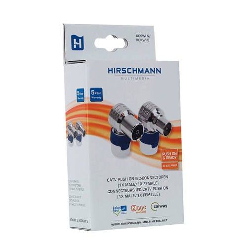 Hirschmann KOSWI 5/KOKWI 5 zijn haakse IEC male en female connectoren met hoge afscherming om instraling van 4G te voorkomen. Als je deze connector gebruikt in combinatie met onze KOKA 9 drievoudig afgeschermde kabel, dan maak je een 4G proof connectie. Het nieuwe ontwerp van de connectoren past achter de platste Smart TV's. Het gepatenteerde binnenwerk heeft ingebouwde trekonlasting. De connector bestaat uit maar 2 delen zodat deze snel en gemakkelijk aangesloten kan worden. Het plastic kapje is huid vriendelijk. Dit artikel wordt geleverd in een verpakking met uitgebreide productbeschrijving.