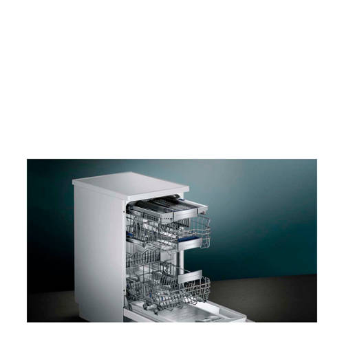 Deze Siemens SR256W01TE stille, vrijstaande vaatwasser met energieklasse A+++, is geschikt voor 10 couverts. Je hebt de keuze uit 6 temperatuurstanden en 6 wasprogramma’s: Intensief 70 °C, Auto 45-65 °C, Eco 50 °C, Stil 50 °C, Kort 60 °C, Glas 40 °C. Deze vaatwasser gaat voorzichtig om met jouw glaswerk. Met het varioSpeed Plus-programma wordt jouw vaat perfect schoon terwijl je wascyclus met 66% is verkort. De varioLadePro en de varioFlexPro-korven deel je snel en eenvoudig in met behulp van speciale hendels waardoor je ze in drie stappen kunt verstellen. Specificaties:- Droogsysteem: warmtewisselaar- Aquasensor- Aquastop- Glasbescherming- Verstelbare bovenkorf- Ingebouwd display- Bestekvoorziening: VarioLade Pro, VarioFlex Pro-korven- Soort bediening: knoppen - Snoerlengte: 1.75 meter- Lengte afvoerslang: 2.05 meter- Lengte watertoevoerslang: 1.65 meter- Uitgestelde start- Resttijdindicatie- Kinderslot- Dosering assistent- Glansmiddelindicator- Zout indicator