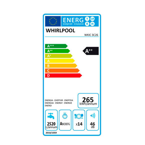 De Whirlpool WFC 3B+26 X vaatwasser met energieklasse A++ heeft een breedte van 60 cm. Deze afwasautomaat heeft 5 programma's, namelijk; Voorspoelen, Koud, Eco 50°C, Snel 30’- , Normaal 55°C. De WFC 3B+26 X heeft ruimte voor 14 couverts en beschikt over een afwas en droogresultaat A. Door je vaatwasser 's nachts te laten draaien kun je profiteren van het goedkope nachttarief. Deze vaatwasser beschikt over een startuitstel van 1-24 uur en een resttijdindicatie. Verder is deze vaatwasser flexibel in te delen dankzij de inklapbare opzetrekjes in de bovenkorf en de neerklapbare bordensteunen en bestekmand in de onderkorf. Verder met Multizone, aansluiting op warmwaterkraan mogelijk (max 60°C) voor energiebesparing. AntibacterieelComplete innerlijke rust. Het Antibacterieel programma verwijdert effectief bacterieën voor een gegarandeerd hygiënisch schone vaat.Optie Halve lading Een lager verbruik. Deze optie bespaart middelen bij het afwassen van een kleine lading. Optimalizeer water en energie consumptie tijdens het wassen van een kleine lading op beide rekken En dat is goed voor het milieu en je portemonnee.In hoogte verstelbaar bovenkorfIn hoogte verstelbaar bovenkorf. Het in hoogte verstelbaar bovenkorf van je vaatwasser geeft je extra ruimte als nodig en komt ook van pas bij grotere voorwerpen.WaterslotDeze Whirlpool vaatwasser beschikt over een beveiligingsklep, geïntegreerd in de toevoerslang waardoor de watertoevoer wordt afgesloten zodra er een lekkage optreedt.