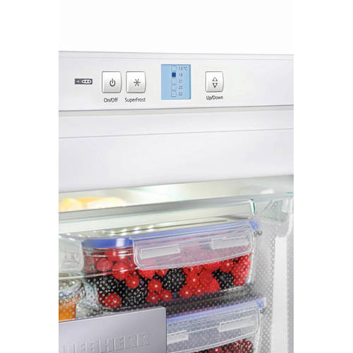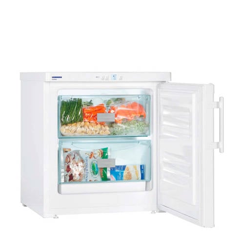Liebherr GX823-20 barmodel vrieskast met energieklasse A+ en een vriesruimte van69 liter. De GX823-20 heeft onder andere een optisch temperatuuralarm, een kinderbeveiliging, een LCD-temperatuurdisplay en2 vriesladen. Tevens beschikt de vriezer over SmartFrost, VarioSpace, FrostSafe en SuperFrost.SmartFrostSmartFrost staat voor: minder rijpvorming, snel ontdooien en eenvoudig schoonmaken. SmartFrost is een alternatief voor NoFrost (nooit meer ontdooien) en zogenaamde statische vriezers (minimaal 2x per jaar ontdooien).VariospaceVarioSpace staat voor variabel te gebruiken ruimte. Het biedt de mogelijkheid de vriesruimte aan te passen aan het formaat van de in te vriezen producten. Dankzij de vervanging van vaste verdamperplaten door glasplateaus, is het mogelijk de glasplateaus en laden uit te nemen waardoor één grote vriesruimte ontstaat. Uitnemen van een glasplateau en een lade biedt daardoor ruimte aan extra hoge producten.FrostSafe Met het FrostSafe systeem van Liebherr wordt er rondom elke vrieslade koude geproduceerd. Hierdoor kun je iedere lade zowel voor invriezen als voor het bewaren van uw producten gebruiken. Het lastige overpakken van bevroren producten behoort hiermee tot het verleden. De rondom gesloten, transparante vriesladen functioneren ieder op zich als een koude safe en bieden een goed overzicht over al je producten.SuperFrost SuperFrost verlaagt de temperatuur automatisch tijdelijk naar -32°C waarmee een koudereserve voor vitaminevriendelijk invriezen wordt gecreëerd. Te langzaam invriezen zorgt ervoor dat de cellen beschadigd raken wat bij het ontdooien van het product leidt tot vochtverlies. Wanneer bijvoorbeeld vlees te langzaam is ingevroren zal bij het ontdooien veel vocht weglopen wat de dichtheid en smaak van het product nadelig beïnvloedt. Bij het inschakelen van SuperFrost wordt de temperatuur snel verlaagd naar -32°C. Wanneer warmere, pas gekochte levensmiddelen in de vriezer worden gelegd zal de temperatuur in de vriezer wel stijgen maar deze zal niet boven de -18°C uitkomen. Hierdoor zullen enerzijds de reeds ingevroren levensmiddelen diepgevroren blijven en anderzijds zullen de verse producten sneller worden ingevroren waarmee de celstructuur van de producten niet wordt aangetast en smaak, vitaminen en structuur behouden blijven.Wijziging draairichting deurDe draairichting van de deur(en) is te wijzigen naar eigen inzicht. Het is mogelijk dit zelf te doen of onze bezorger zet hem tegen een geringe vergoeding voor je om. Je kunt dit aangeven onder het kopje service.