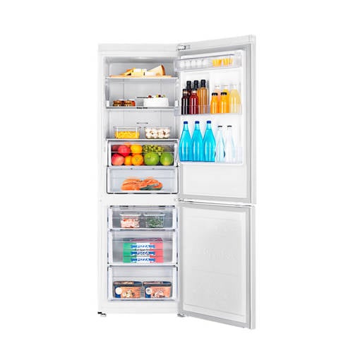 Samsung RB33J3205WW/EF koelvries combinatie. Deze Samsung koelvriescombinatie is van alle gemakken voorzien. Ruimte voor grote items, All Around Cooling en een systeem dat ijsvorming tegengaat. Je koeling en vriezer inruimen deed je nog nooit zo efficiënt. De Samsung RB33J3205WW/EF is een vrijstaande koelvriescombinatie met het vriesvak onder. Met een geluidsniveau van 40 dB is dit een relatief stille koelvriescombinatie. Laat je de deur openstaan, dan zal de RB33J3205WW/EF je waarschuwen met het open deur alarm. Het ruime koelgedeelte van de Samsung RB33J3205WW/EF heeft een inhoud van 230 liter en is voorzien van 8 glazen legplateaus. De twee groentelades onderin helpen je om groenten en fruit vers en smakelijk te houden. Het koelgedeelte heeft 4 deurvakken, waarvan één extra ruime. Grote flessen kan je dus altijd kwijt. Eieren kan je netjes opbergen in het eierenrekje. Door het All Around Cooling systeem van Samsung blijft elke plek in de koeling nauwkeurig even koel. De handige vriezer van de RB33J3205WW/EF heeft een vriescapaciteit van 13 kg per 24 uur en is voorzien van een snelvriesfunctie. Je vindt 3 legplateaus in de vriezer. De totale inhoud van het vriesgedeelte is 98 liter. De RB33J3205WW/EF is zuinig met energie en valt onder de energieklasse A++. Eén van de technologieën die ervoor zorgt dat deze koelvriescombinatie zo zuinig is, is het Multi-Airflow systeem. Deze Samsung innovatie zorgt ervoor dat het vriesgedeelte ijsvrij blijft, en het koelgedeelte condensvrij. De koelvriescombinatie slijt daardoor minder snel en verbruikt minder energie. Jouw energie blijft ook gespaard, want je hoeft het vriesgedeelte niet meer te ontdooien met Multi-Airflow! Een andere Samsung technologie van de RB33J3205WW/EF is de Digital Inverter compressor. Dit intelligente systeem regelt op basis van de benodigde koeling hoe intensief de koelkast moet werken. Zo koelt de RB33J3205WW/EF altijd zuinig. De zuinige Samsung RB33J3205WW/EF helpt jou met vers eten door de handige indeling én het Multi-Airflow systeem. Je items blijven gelijkmatig koel en ontdooien is niet meer nodig. Door de prettig ingedeelde ruimte met extra groot deurvak is er voor al je voedingswaren een geschikte plek.Wijziging draairichting deurDe draairichting van de deur(en) is te wijzigen naar eigen inzicht. Het is door de aanwezige elektronica niet eenvoudig dit zelf te doen. Je kunt de servicedienst van Samsung in je regio benaderen om dit tegen een vergoeding voor je te regelen. Mocht je toch besluiten om dit klusje zelf te klaren, valt de eventuele schade die wordt veroorzaakt bij pogingen om de deuropening om te draaien niet onder de garantie van Samsung. Wehkamp kan deze service helaas niet aanbieden.