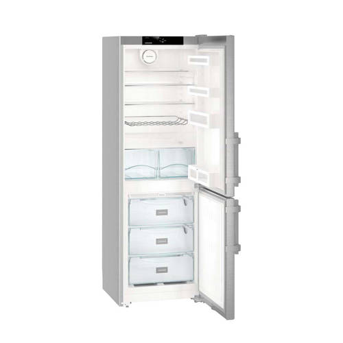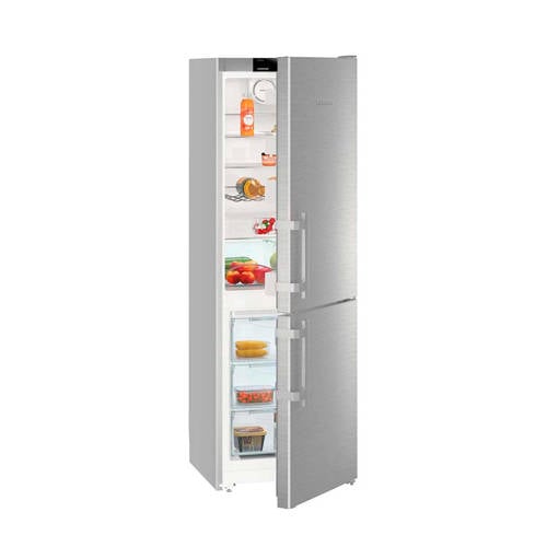 Liebherr CNef 3515 koelvriescombinatie met de superzuinige energieklasse A++, een koelruimte van 221 liter en een 4 sterren vriesruimte van 87 liter. Deze koelvriescombinatie onder andere 4 legplateaus ( 3 in hoogte verstelbaar – waarvan 1 deelbaar en 1 2 groenteladen), een flessenrek, 3 transparante diepvriesladen en een invriesvermogen van wel 11 kg per 24 uur. Deze koelvriescombinatie is uitgevoerd met zilverkleurige zijkant en een Smart Steel edelstalen deur - SmartSteel vermindert de zichtbaarheid van vingerafdrukken aanmerkelijk en is door de verdeling van het edelstaal bijzonder gemakkelijk te reinigen en bovendien veel ongevoeliger voor krassen. De hevelgrepen zijn gemaakt van massief aluminium. Op het SmartSteel vermindert de zichtbaarheid van vingerafdrukken aanmerkelijk en is door de verdeling van het edelstaal bijzonder gemakkelijk te reinigen en bovendien veel ongevoeliger voor krassen. Op het 2,4' touch TFT-display met digitale temperatuurweergave zijn de temperaturen gemakkelijk in te stellen en af te lezen. Tevens beschikt de koelvriescombinatie over LED plafond verlichting, een optisch en akoestisch deuralarm en temperatuur alarm voor het koele en vriesgedeelte, VarioSpace in het vriesvak en SuperFrost. En ontdooien behoort tot het verleden dankzij NoFrost – deze zorgt voor snel invriezen met gekoelde lucht, terwijl vochtige lucht wordt afgevoerd waardoor er geen ijsvorming in de vriezer ontstaat. Het staat garant voor het veilig en langdurig bewaren van levensmiddelen. NoFrost biedt meer opslagcapaciteit. VariospaceVarioSpace staat voor variabel te gebruiken ruimte. Het biedt de mogelijkheid de vriesruimte aan te passen aan het formaat van de in te vriezen producten. Dankzij de vervanging van vaste verdamperplaten door glasplateaus, is het mogelijk de glasplateaus en laden uit te nemen waardoor één grote vriesruimte ontstaat. Uitnemen van een glasplateau en een lade biedt daardoor ruimte aan extra hoge producten.SuperFrost SuperFrost verlaagt de temperatuur automatisch tijdelijk naar -32°C waarmee een koudereserve voor vitaminevriendelijk invriezen wordt gecreëerd. Te langzaam invriezen zorgt ervoor dat de cellen beschadigd raken wat bij het ontdooien van het product leidt tot vochtverlies. Wanneer bijvoorbeeld vlees te langzaam is ingevroren zal bij het ontdooien veel vocht weglopen wat de dichtheid en smaak van het product nadelig beïnvloedt. Bij het inschakelen van SuperFrost wordt de temperatuur snel verlaagd naar -32°C. Wanneer warmere, pas gekochte levensmiddelen in de vriezer worden gelegd zal de temperatuur in de vriezer wel stijgen maar deze zal niet boven de -18°C uitkomen. Hierdoor zullen enerzijds de reeds ingevroren levensmiddelen diepgevroren blijven en anderzijds zullen de verse producten sneller worden ingevroren waarmee de celstructuur van de producten niet wordt aangetast en smaak, vitaminen en structuur behouden blijven.Wijziging draairichting deurDe draairichting van de deur(en) is te wijzigen naar eigen inzicht. Het is door de aanwezige elektronica niet eenvoudig dit zelf te doen. Je kunt de servicedienst van Liebherr in je regio benaderen om dit voor je te regelen tegen een vergoeding. Mocht je toch besluiten om dit klusje zelf te klaren, valt de eventuele schade die wordt veroorzaakt bij pogingen om de deuropening om te draaien niet onder de garantie van Liebherr. Wehkamp kan deze service helaas niet aanbieden.